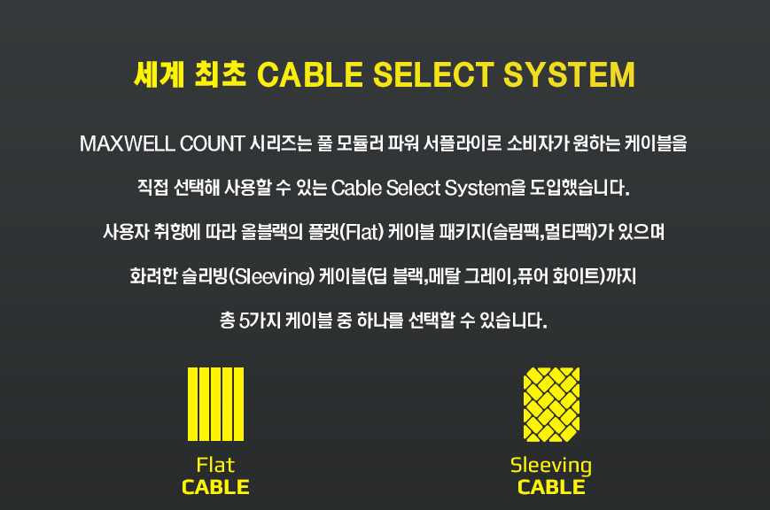 기존 모듈러형 파워서플라이를 구매한 후 슬리빙 케이블을 사용하려고 하면, 기존 케이블이 버려지게 되는 등의 문제점이 있지만, 이번 MAXWELL COUNT 파워서플라이의 경우 구매 이전에 케이블을 바로 선택할 수 있다는 장점이 있습니다.
