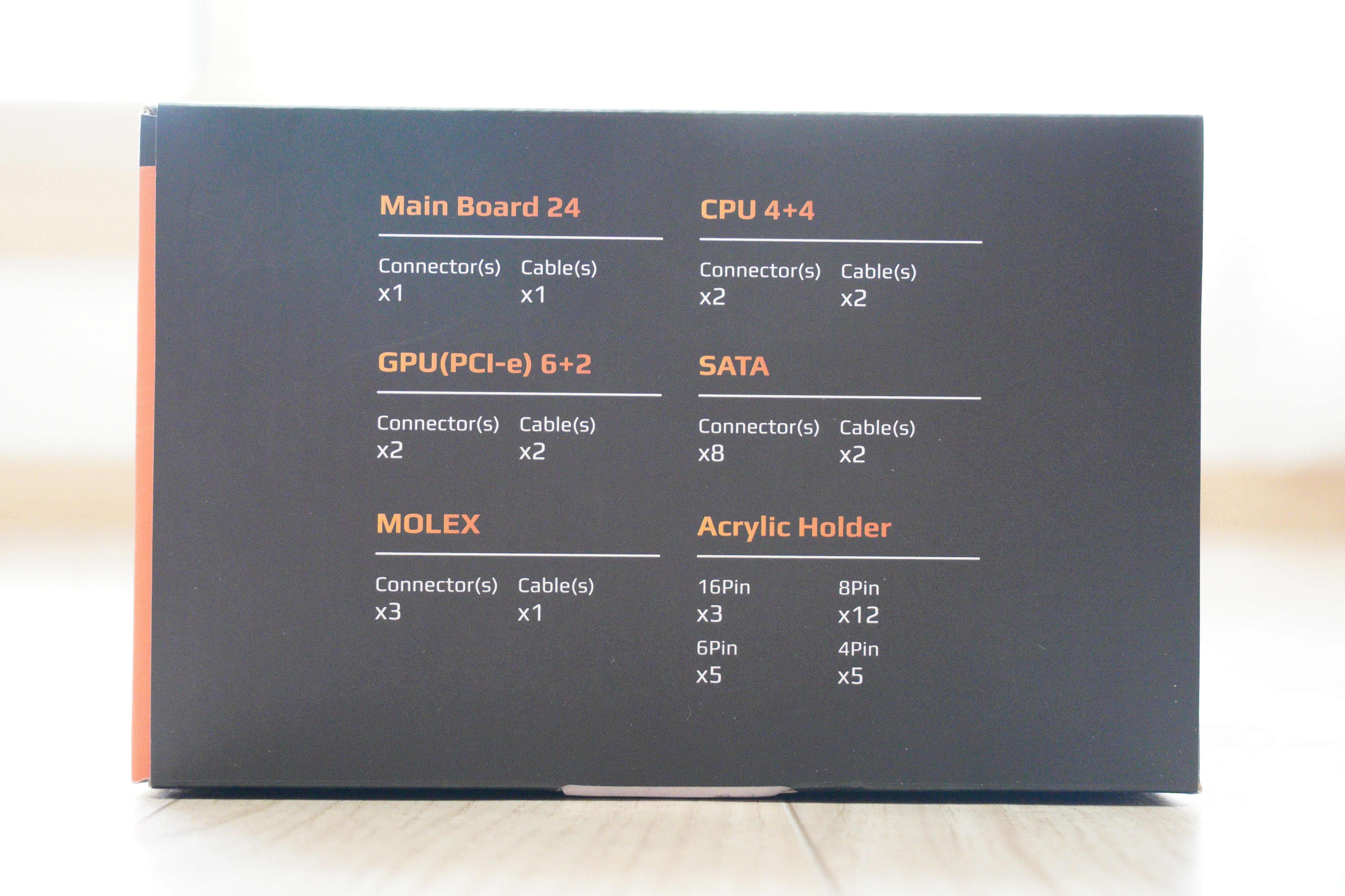 플랫 슬림팩과 슬리빙팩의 경우에는 24핀 1개, CPU(4+4) 케이블 2개, GPU(6+2) 케이블 2개, SATA 케이블 2개, MOLEX 케이블 1개가 구성품이며, 플랫 멀티팩의 경우에만 GPU, MOLEX, SATA 케이블이 각각 1종씩 추가됩니다.