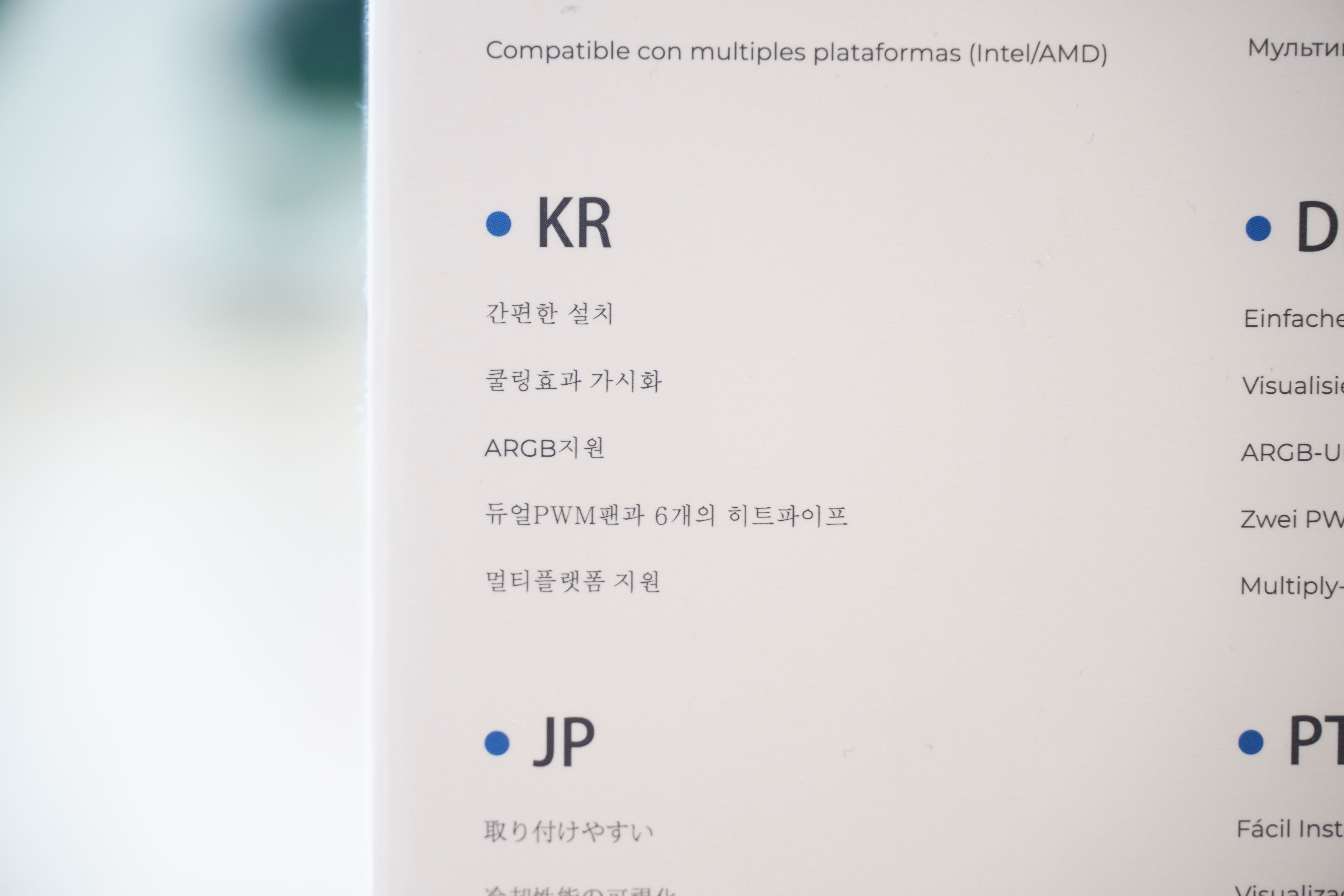 측면에는 번들팬의 LED가 렌더링 되어있으며, 다른 부분에는 간략한 특징이 여러 언어로 적혀있습니다.