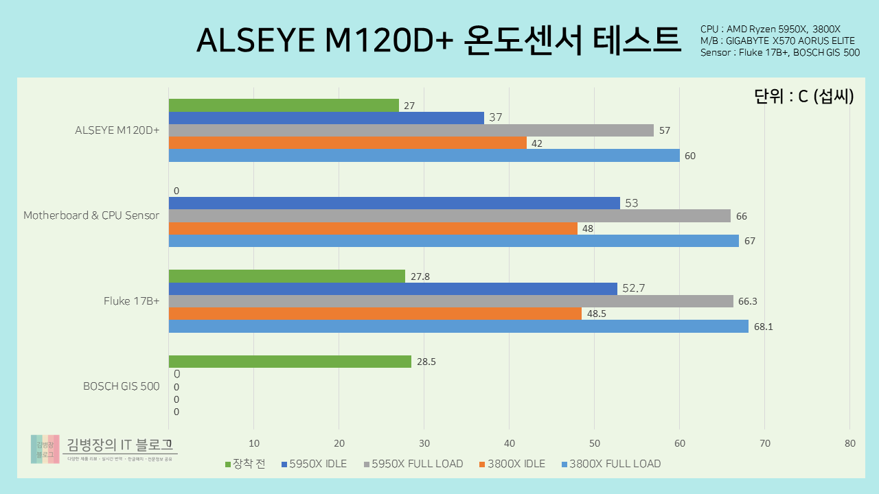 먼저 가장 중요한 온도 테스트입니다. 처음에는 5950X CPU 1품목만 테스트 하려고 하였으나, 실제 유저들이 사용하는 CPU와 괴리감이 있을까봐 과거 사용하던 3800X CPU를 함께 테스트하였습니다.