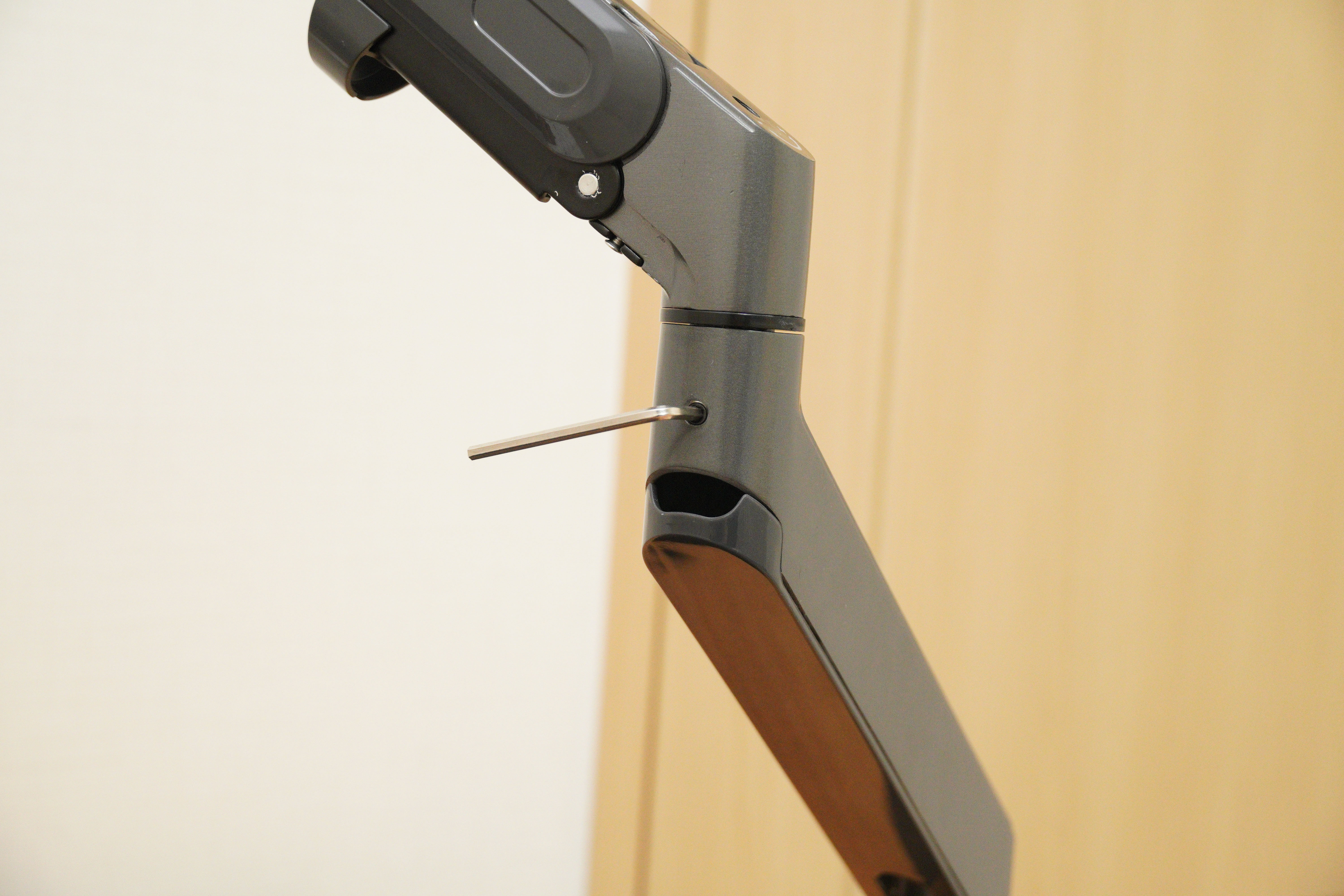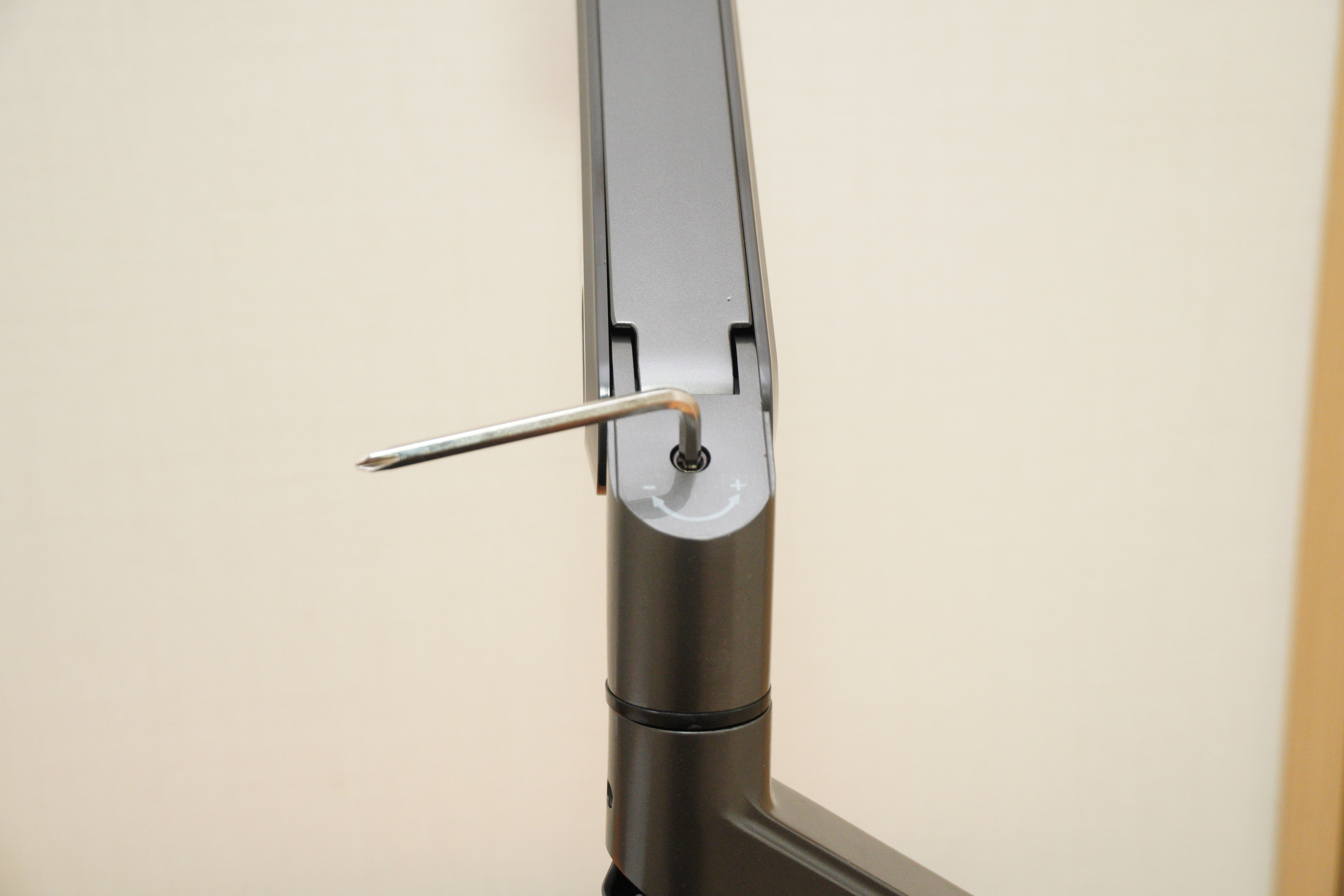 보통은 모니터암의 장력이 높게 설정되어있어 움직이지 않을겁니다. 그러면 - 방향으로 육각렌치를 계속 돌려주다보면, 모니터암이 혼자 내려갈겁니다. 이 사이에 적절한, 원하는 정도의 강도를 설정하시면 됩니다.