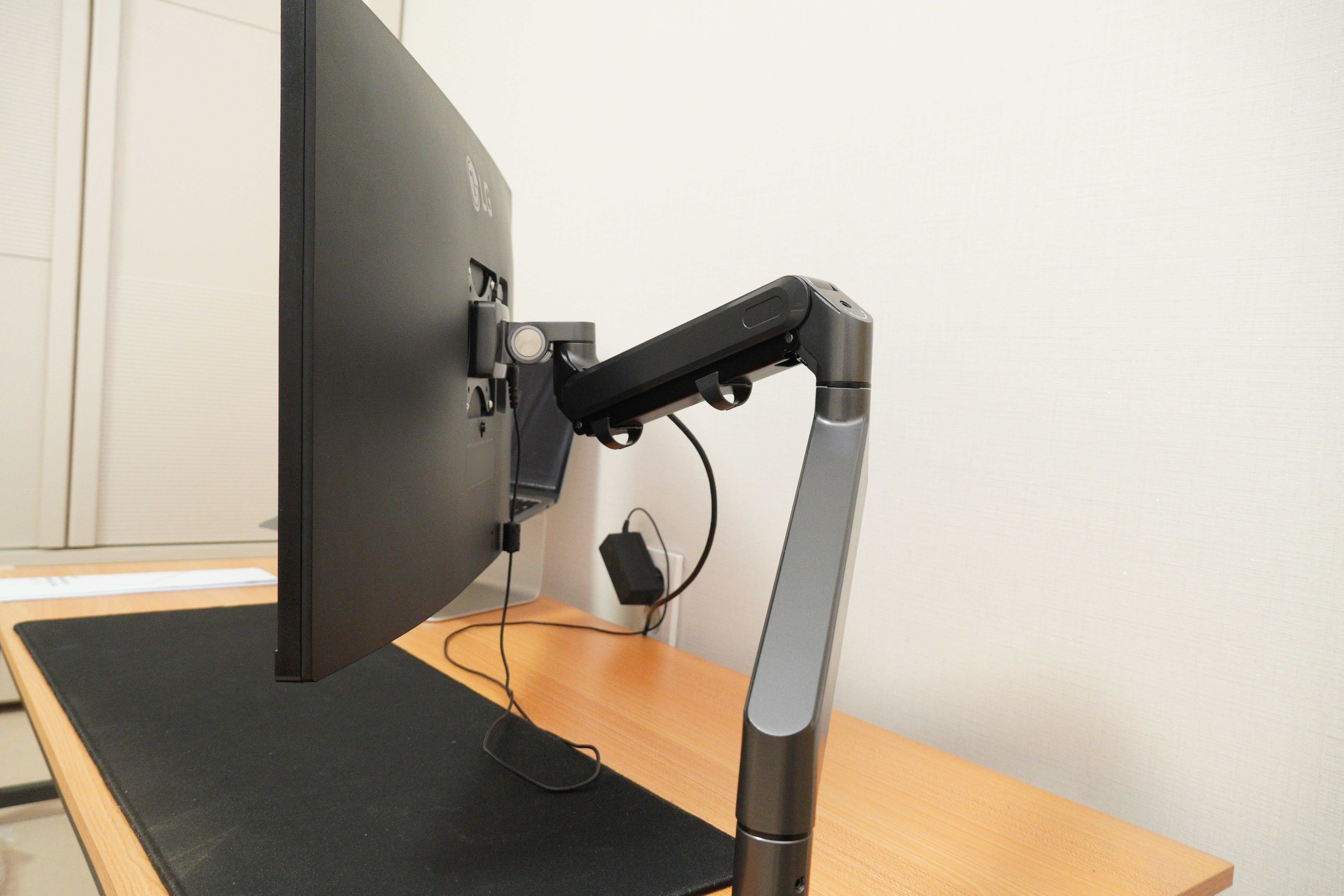 디자인적인 측면에서는, 타사 모니터암과 달리 가스스프링 부분이 바깥으로 두껍게 튀어나오지 않는 구조라 장착시 공간을 더 활용할 수 있다는 장점이 있습니다.