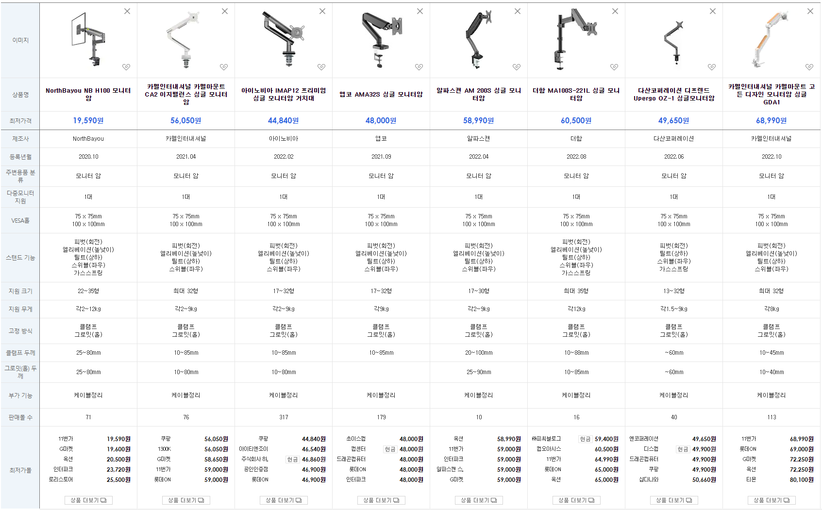다나와에서 비슷한 스펙의 모니터암들을 인기 순으로 배치하여 스크린샷을 찍어보았습니다.