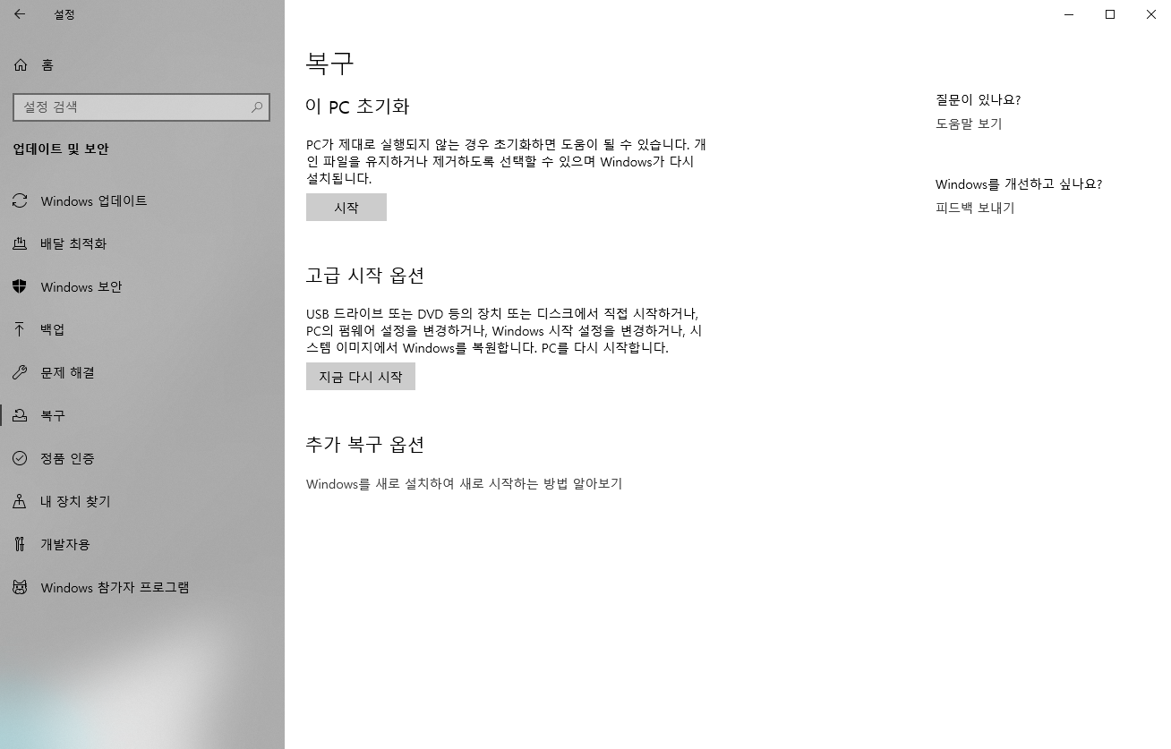 설정에 들어가시면 업데이트 및 보안 항목이 있습니다