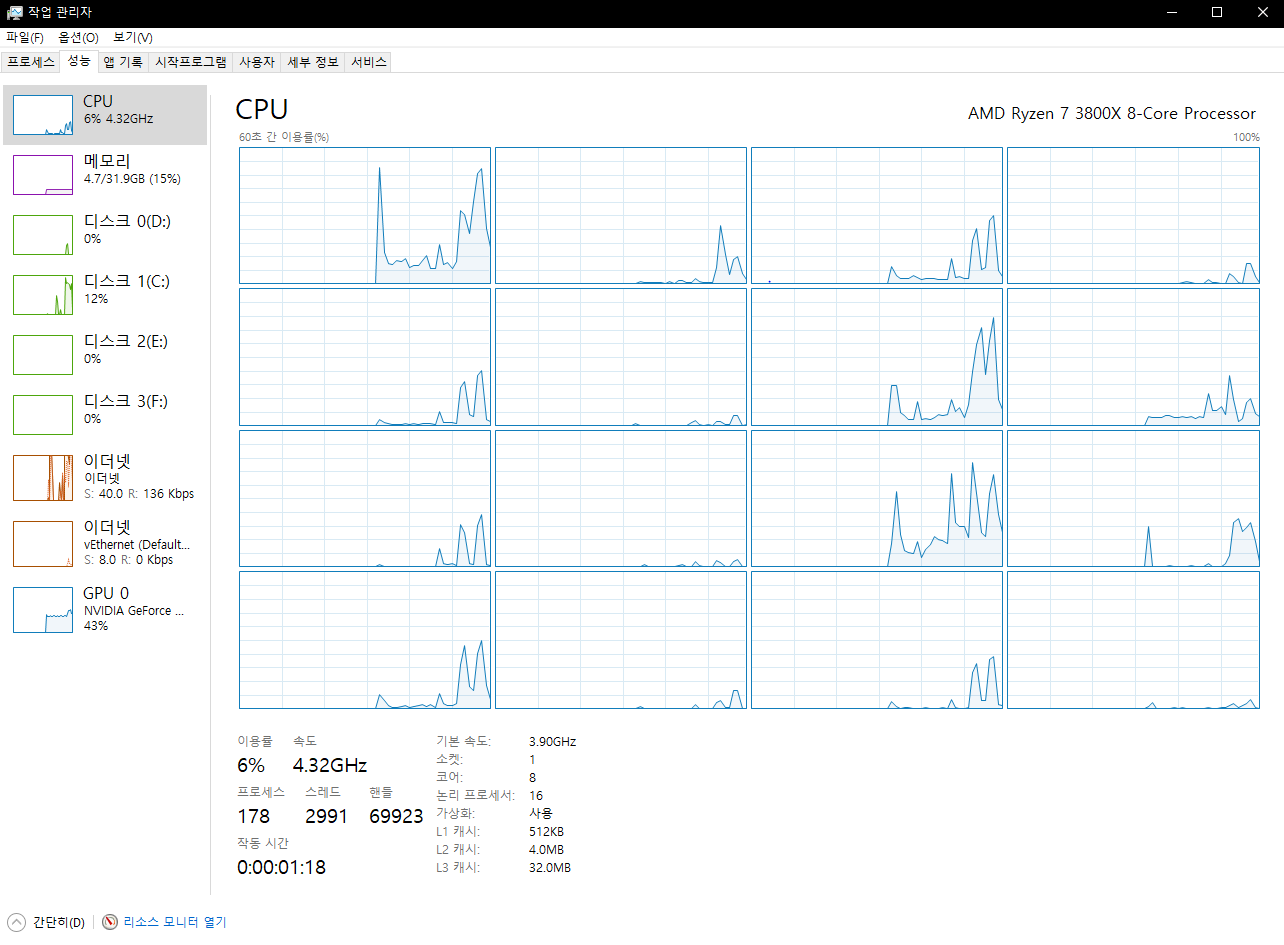 장착 이후 작업관리자 샷입니다. 아이들시 4.35~4.45를 왔다갔다 하는 수치를 보여줍니다.