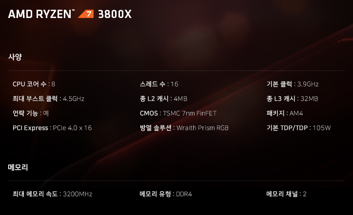 사진과 같습니다. 8코어 16쓰레드 제품이며, 기본 3.9Ghz에서 최대부스트 4.5Ghz 입니다.