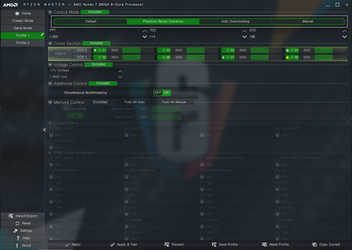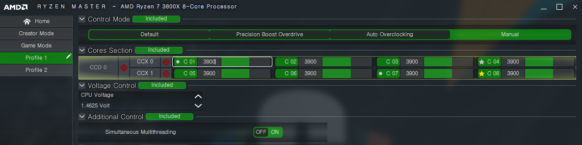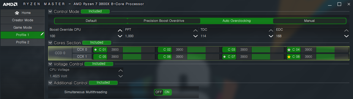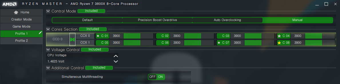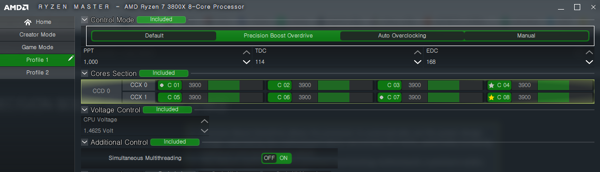 현재 스샷 상태에서는, 각 코어들이 수동으로 동작합니다. 제가 C01을 4000Mhz로 설정하고, C02는 3000Mhz로 설정이 가능합니다. 이부분의 경우 어떻게 활용이 가능하냐면, 지금 코어부분에 별모양과 점모양이 박혀있는 코어들이 있습니다. 별모양의 경우, 가장 빠른 코어를 뜻하고, 점모양은 두번째로 빠른 코어를 뜻합니다. CCX 단위별로 한쌍씩 있습니다. 가장 빠른 코어만 오버클럭한다던가 하는 부분으로 활용이 가능합니다. 다만 이렇게 오버클럭 하실분은 드물다고 생각되네요