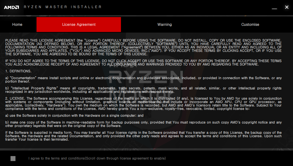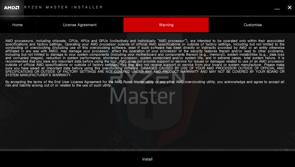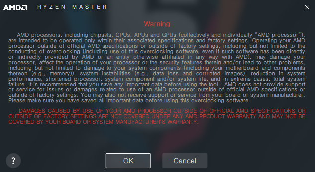 한번 더 경고창이 뜹니다. 라이젠마스터는 AMD CPU 이외에도, APU 라인업, 그리고 그래픽카드도 오버클럭할 수 있고, 전압을 조절할 수 있기 때문에, 해당하는 모든 부분에 대해 오버클럭을 하여 부품에 데미지가 가는 경우, 본인 책임입니다. OK를 눌러 진행합니다.