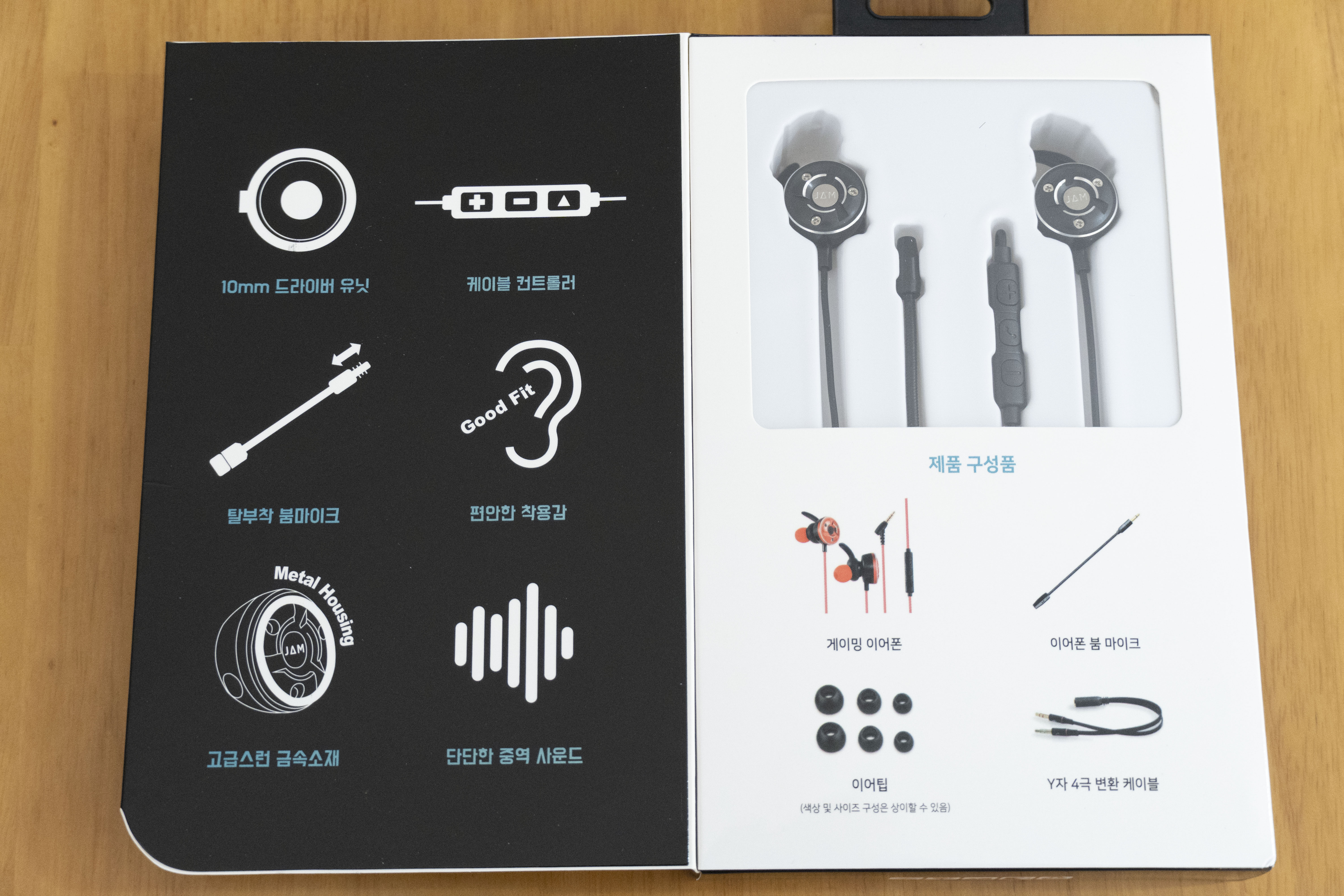 색상은 검빨 두종류입니다. 제품 구성품은 보증서와 이어폰, 탈착형 마이크, 이어팁, Y자 분리잭이 있습니다.