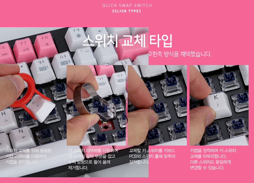 아무래도 이 제품 PC방을 저격해서 나온것 같습니다. IP68 방수지원으로 키보드가 오염되면 물에 담궈 청소하고 말리면 끝이니까 말이죠. 스위치를 고장이 잘나는 부분만 따로 교체가 가능하여 유지보수에도 용이하니 말이죠.