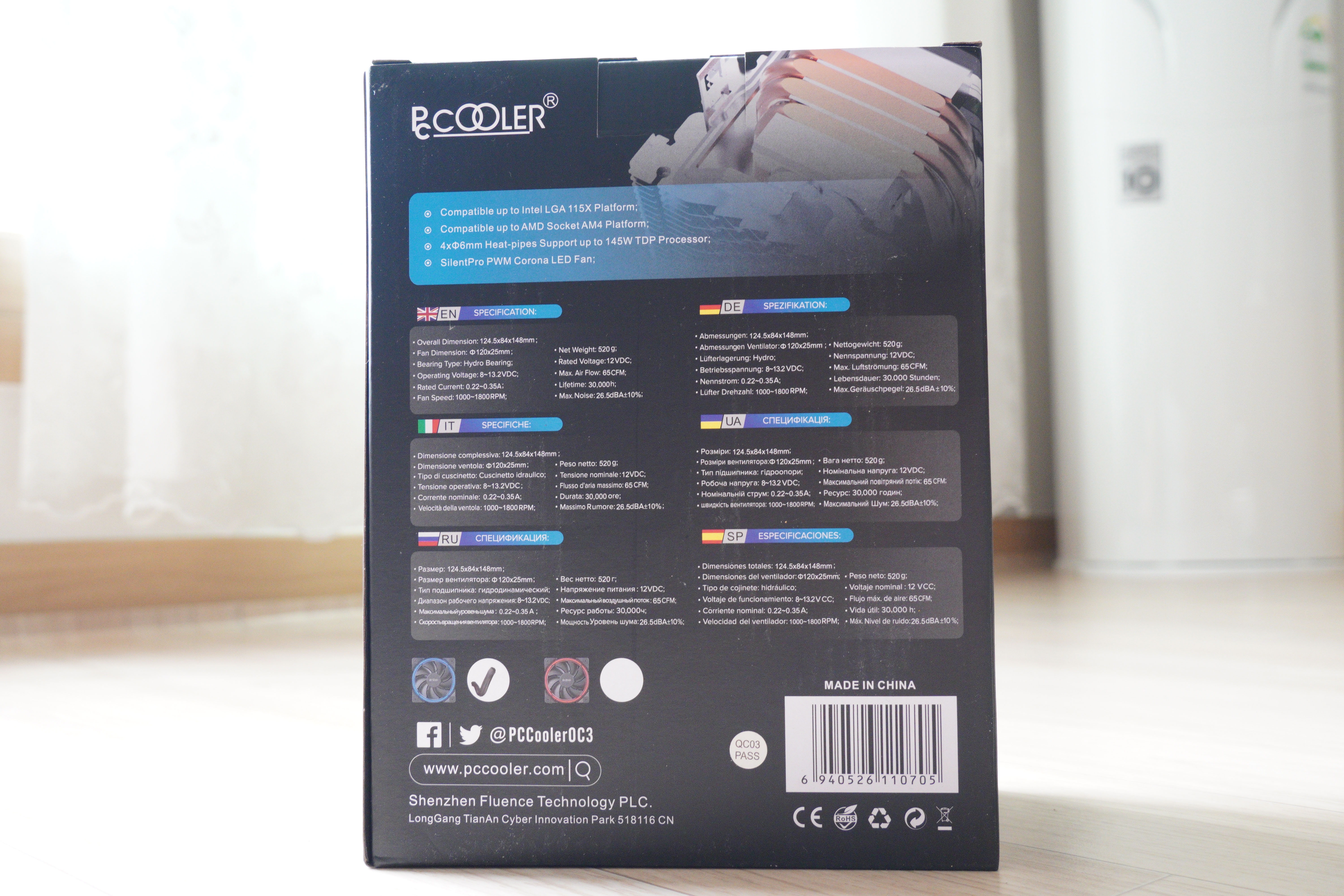 측면에는 간략한 설명이 나와있습니다. LED 내장 120mm 코로나팬, AMD/인텔 모두 지원, 6mm 구리심 히트파이프 x 4개에, 분당 35~65ft^3 입방피트 흡입 및 배출하며, PWM지원 저소음팬이 장착되어있습니다.