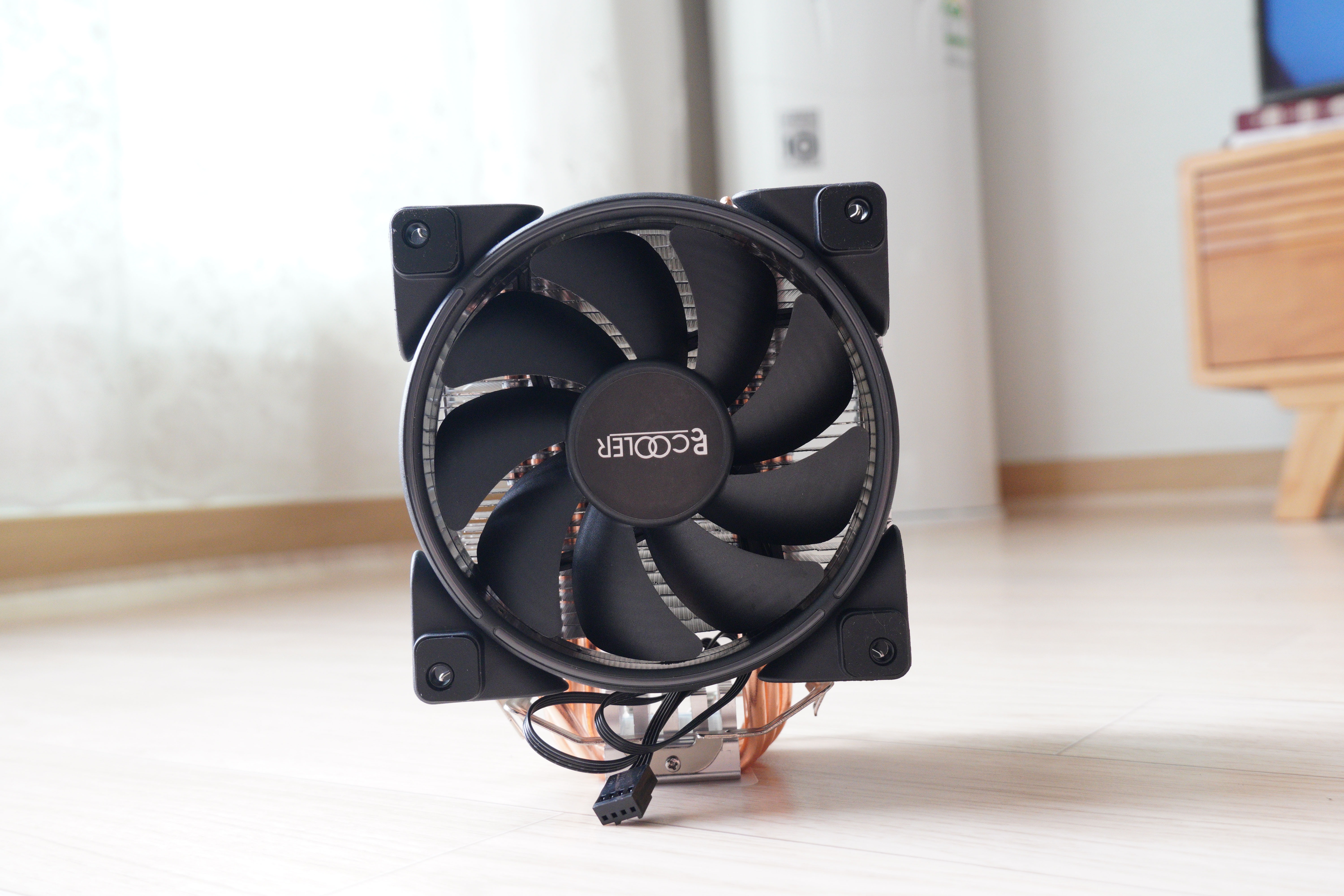 쿨러를 꺼내보았습니다. PCCOOLER 사의 로고가 쿨러 중앙에 박혀있습니다.