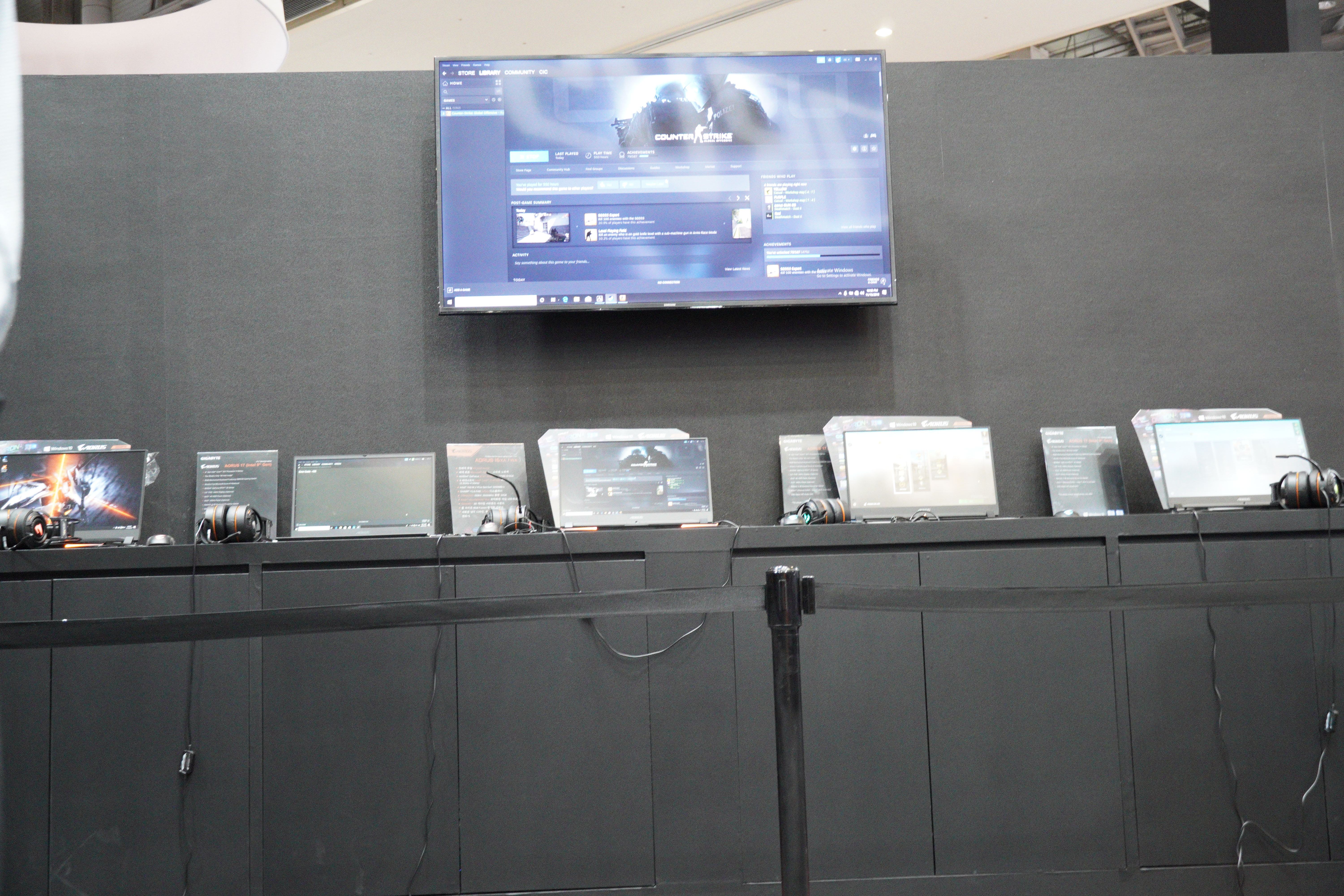 한쪽에는 강력한 기가바이트의 노트북들을 게임을 통해 체험할 수 있었습니다. 이쪽에는 노트북 5대로 번갈아가면서 플레이 할 수 있었고, 보시면 기가바이트 헤드셋, 노트북, 마우스를 활용하여 플레이 할 수 있었습니다.