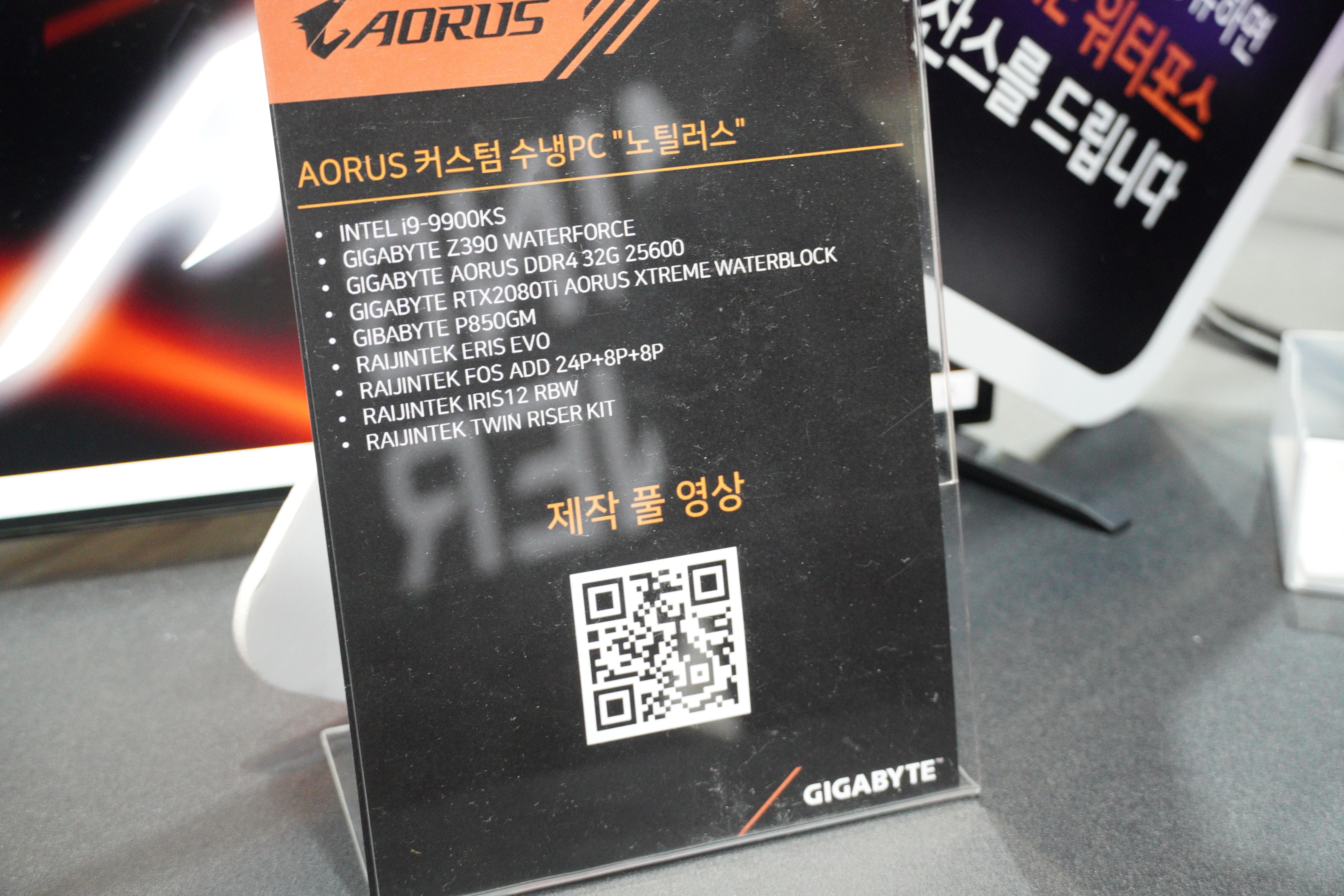 개인적으로 잘 찍었다고 생각하는 샷중 하나! 사람들이 많고 빛반사가 심한데 이놈은 잘찍은것 같네요. 보시면 기가바이트 로고가 박혀있는 CPU-메인보드 전원부 워터블록과 어로스 그래픽카드의 조합은 정말 아름다웠습니다. PC가 탐나네요 ㅋㅋ. 이 컴퓨터는 양컴에서 빌드했다고 나와있습니다.