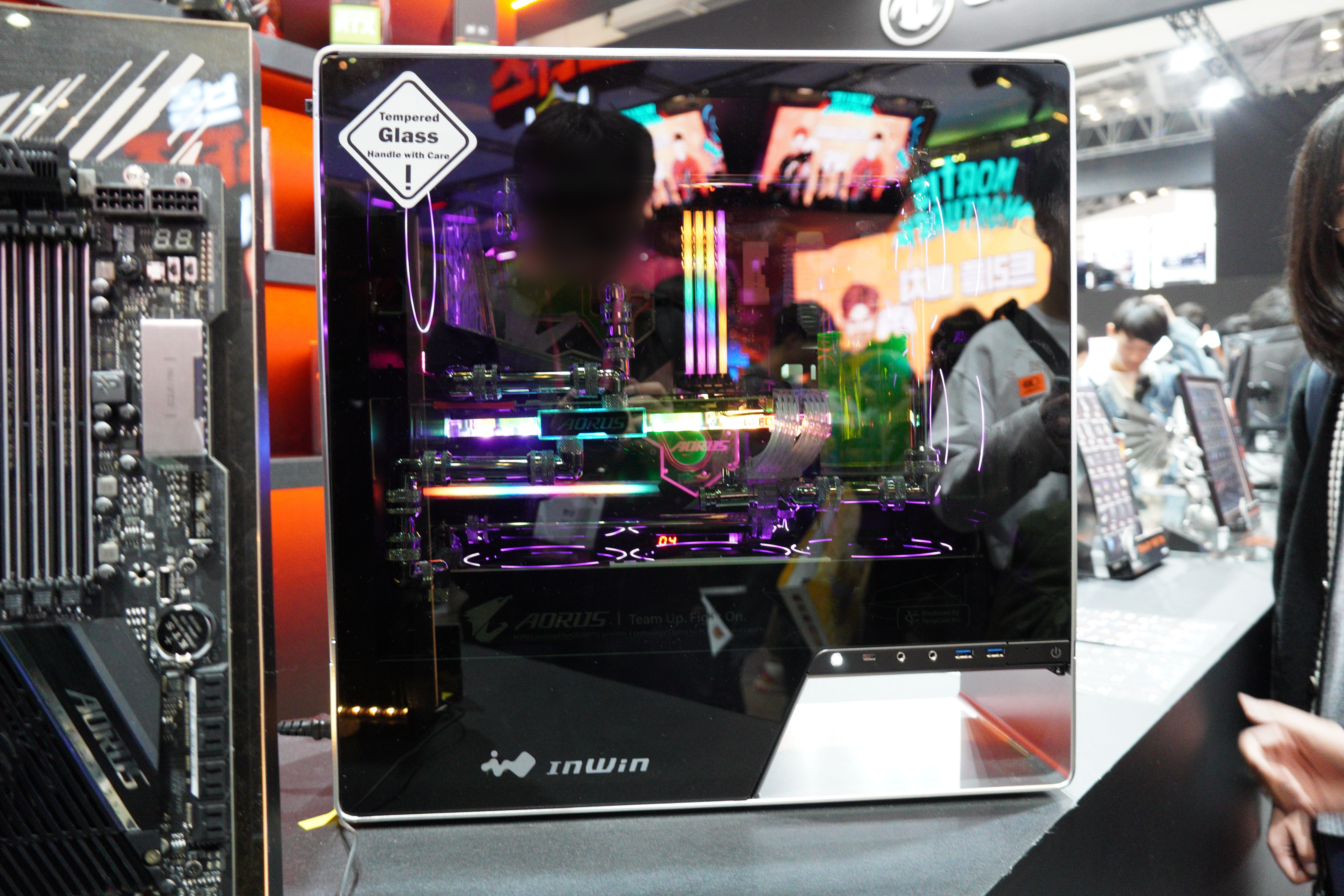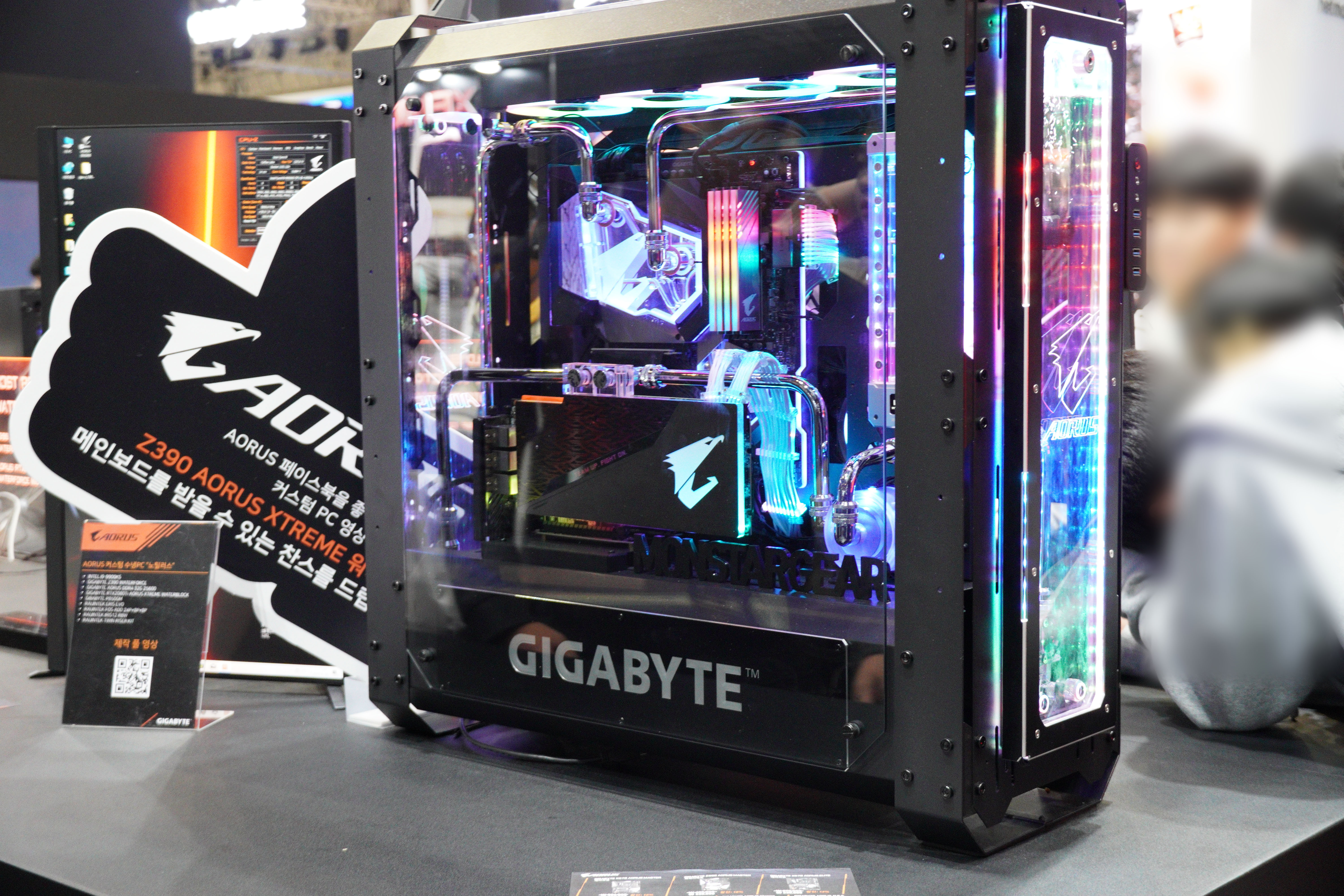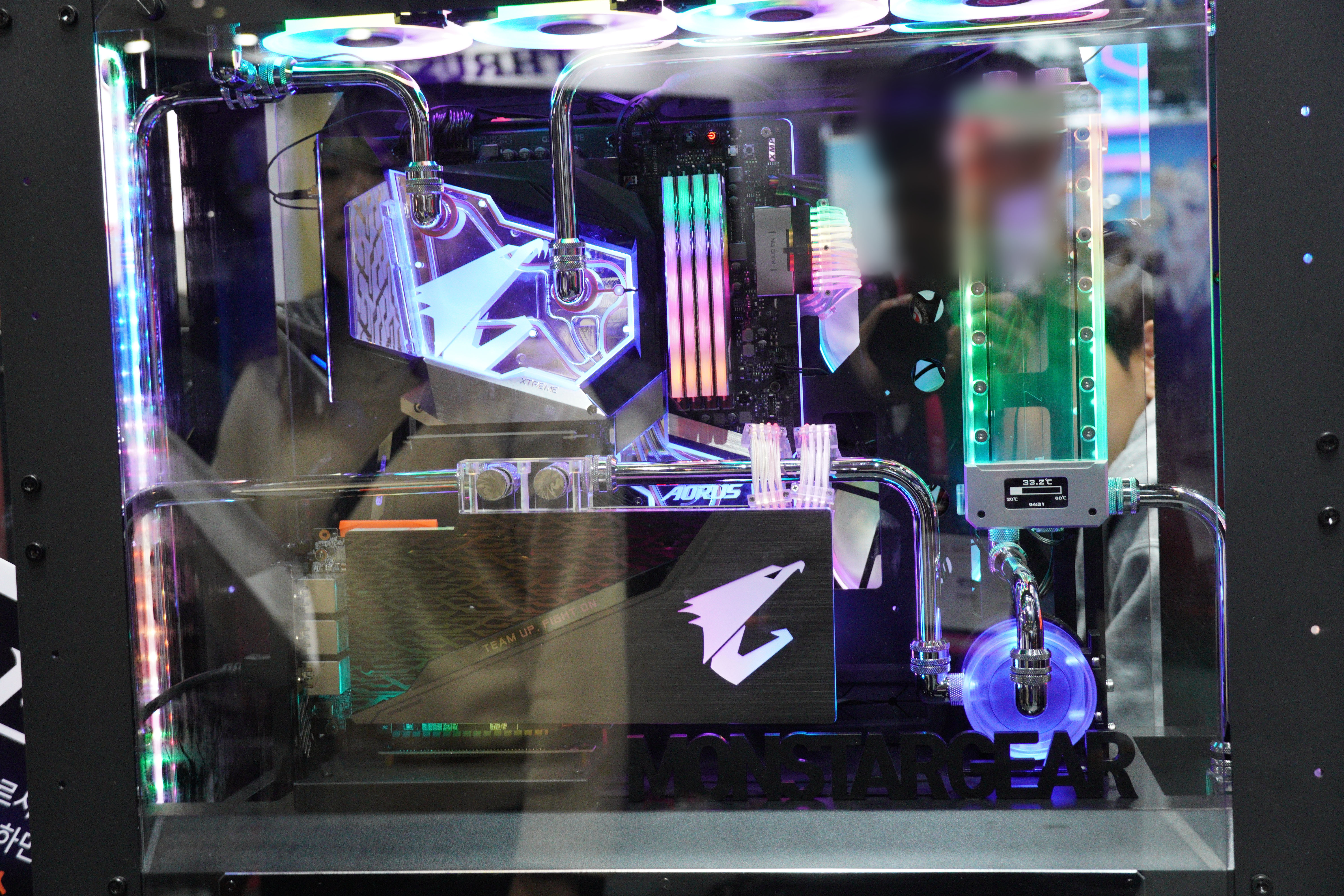 커스텀 수랭 PC도 있었습니다. 워터블럭도 그렇고, 기가바이트의 독수리 로고와 잘 맞는 훌륭한 모딩이였습니다.
