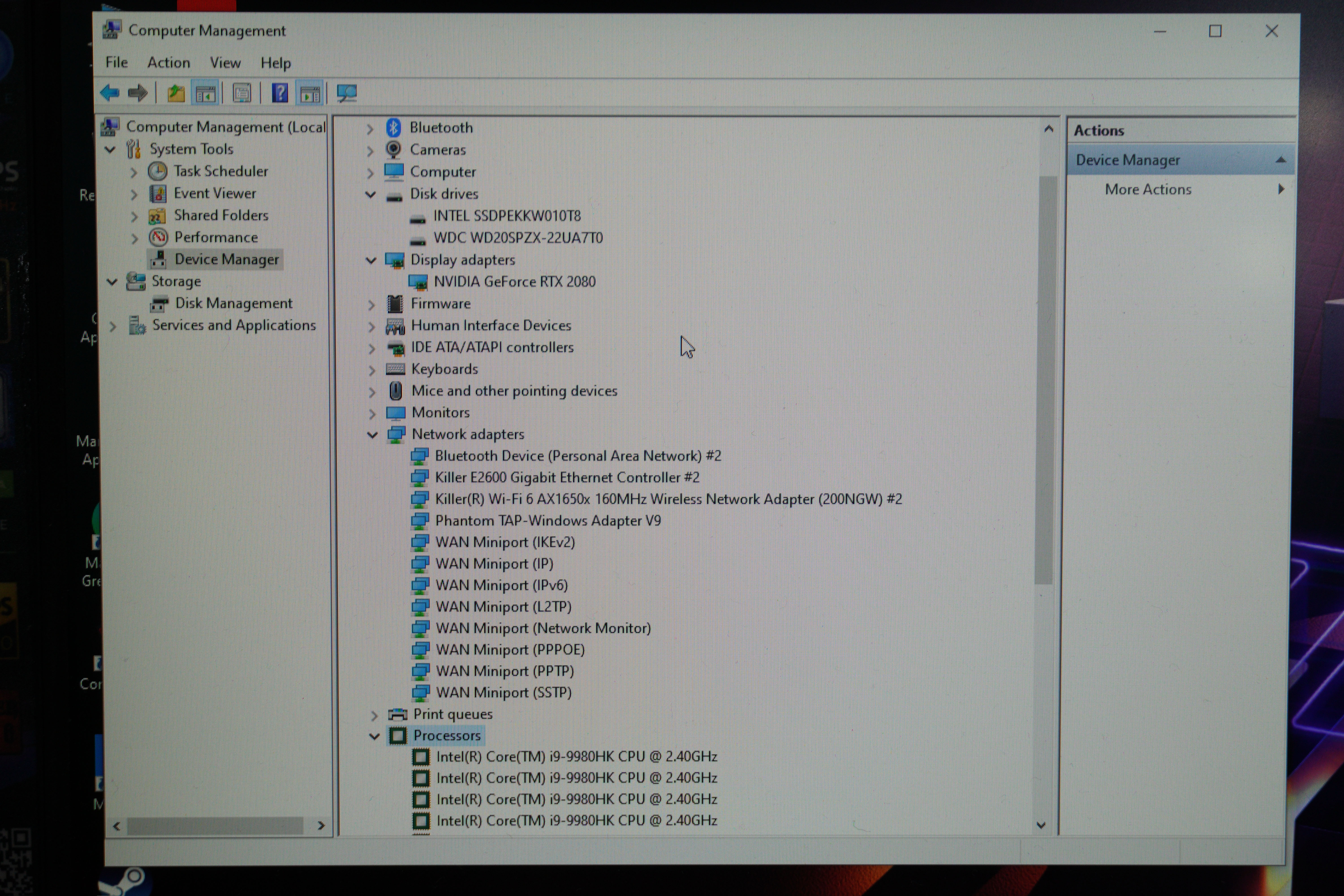 확실히 RTX2080이 통으로 박힌것 같습니다. 장치관리자에 그렇게 나오네요. SSD는 인텔의 NVME SSD가 박혀있고, 내장된 무선랜 카드는 응답속도가 좋기로 유명한 킬러랜이 탑재되어있습니다.