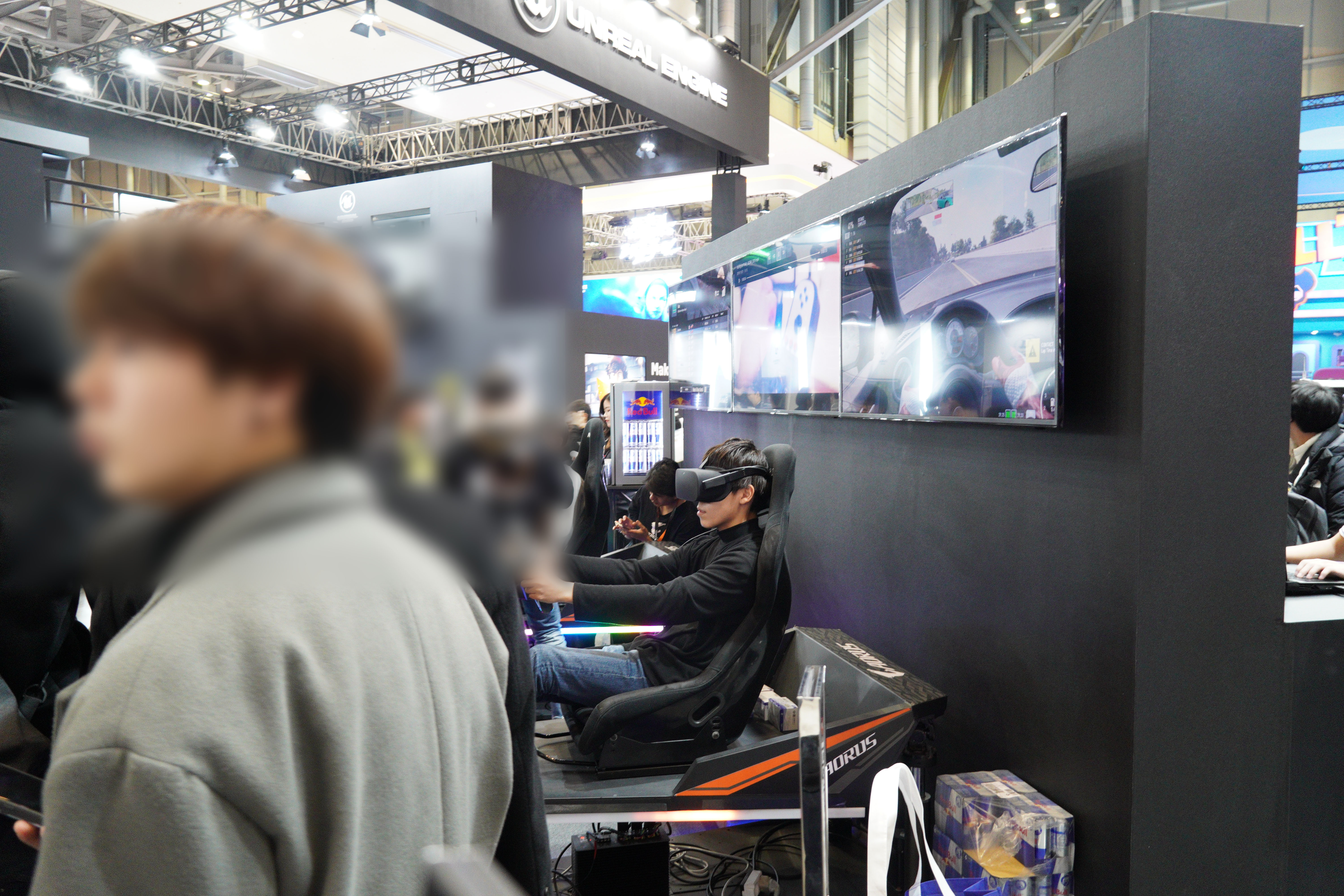 그 반대편에는 VR 헤드셋과 스티어링 휠을 활용한 게임을 플레이 할 수 있었습니다. VR 헤드셋은 처음 봤는데 신기하더라고요