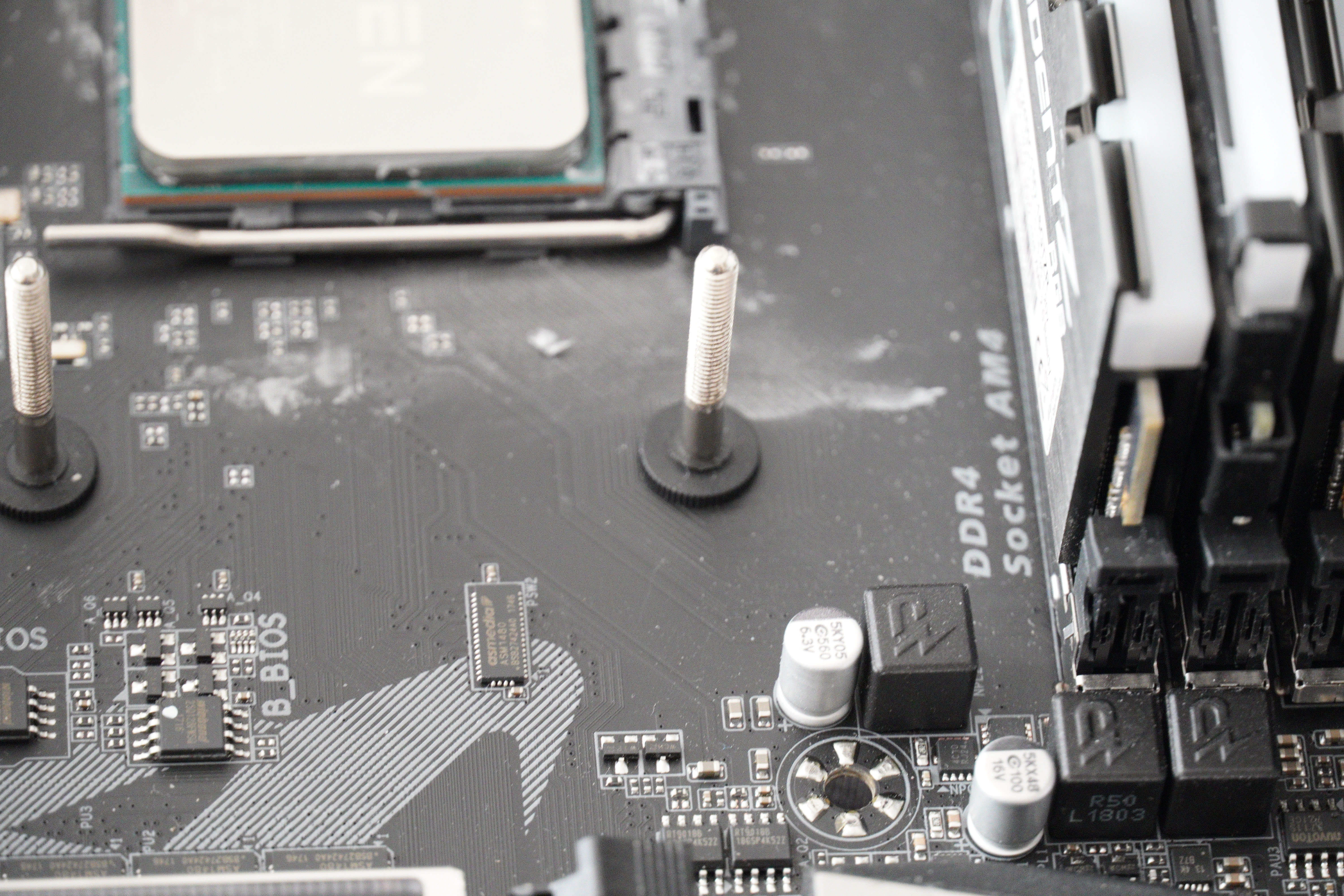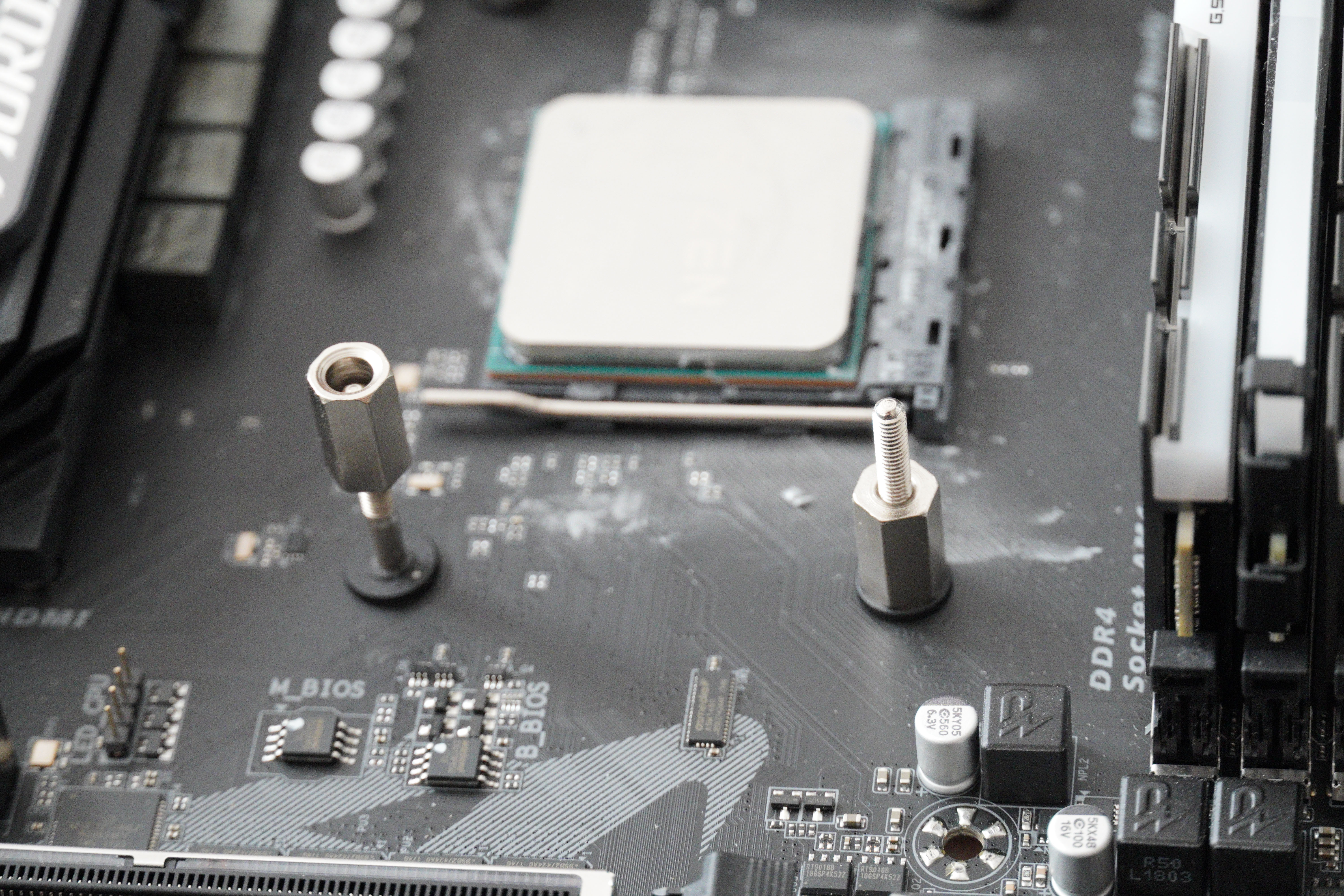 AMD CPU에 쿨러를 결착하려면 먼저 메인보드 뒷면에 붙어지는 브라켓에 고무를 붙여야합니다.