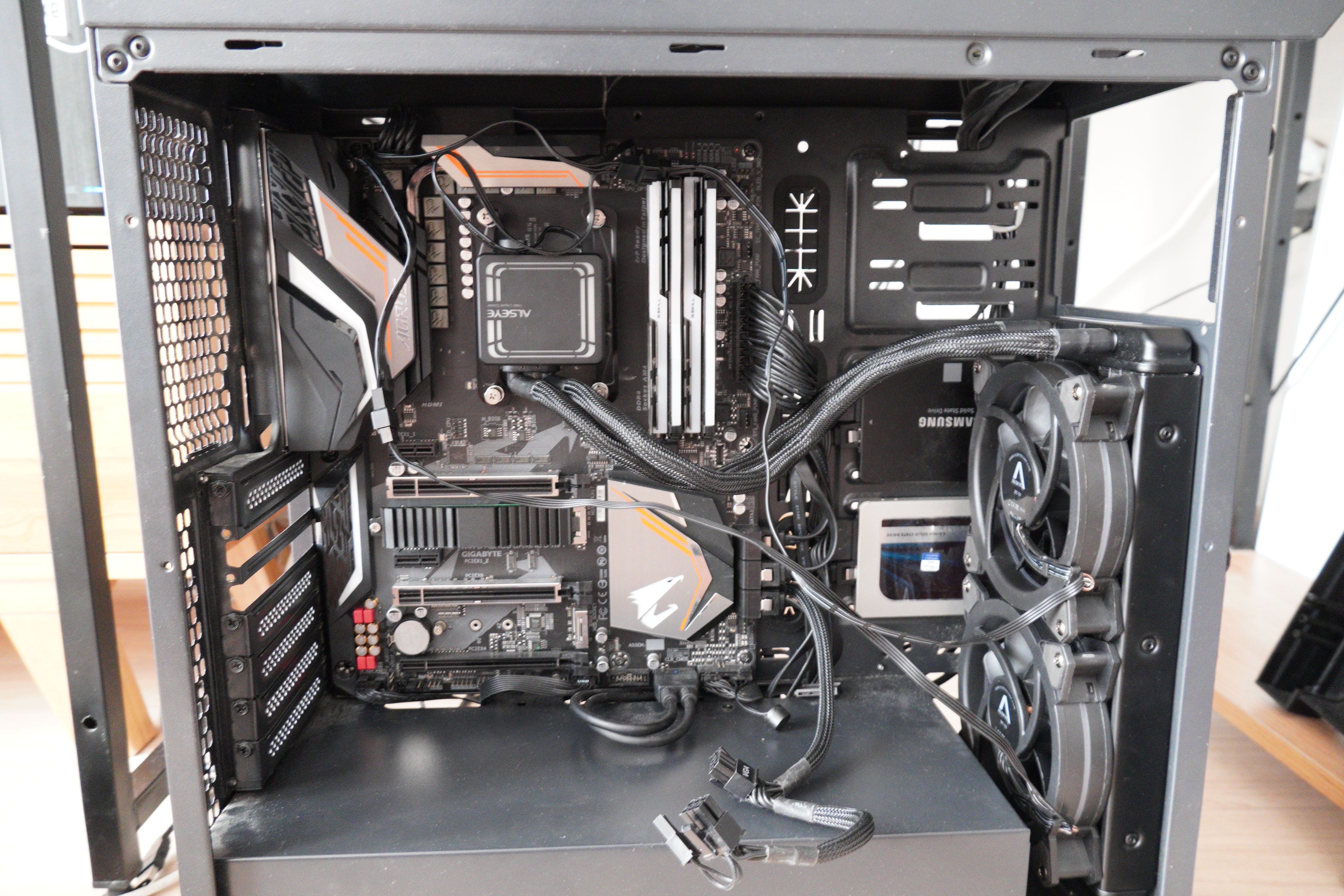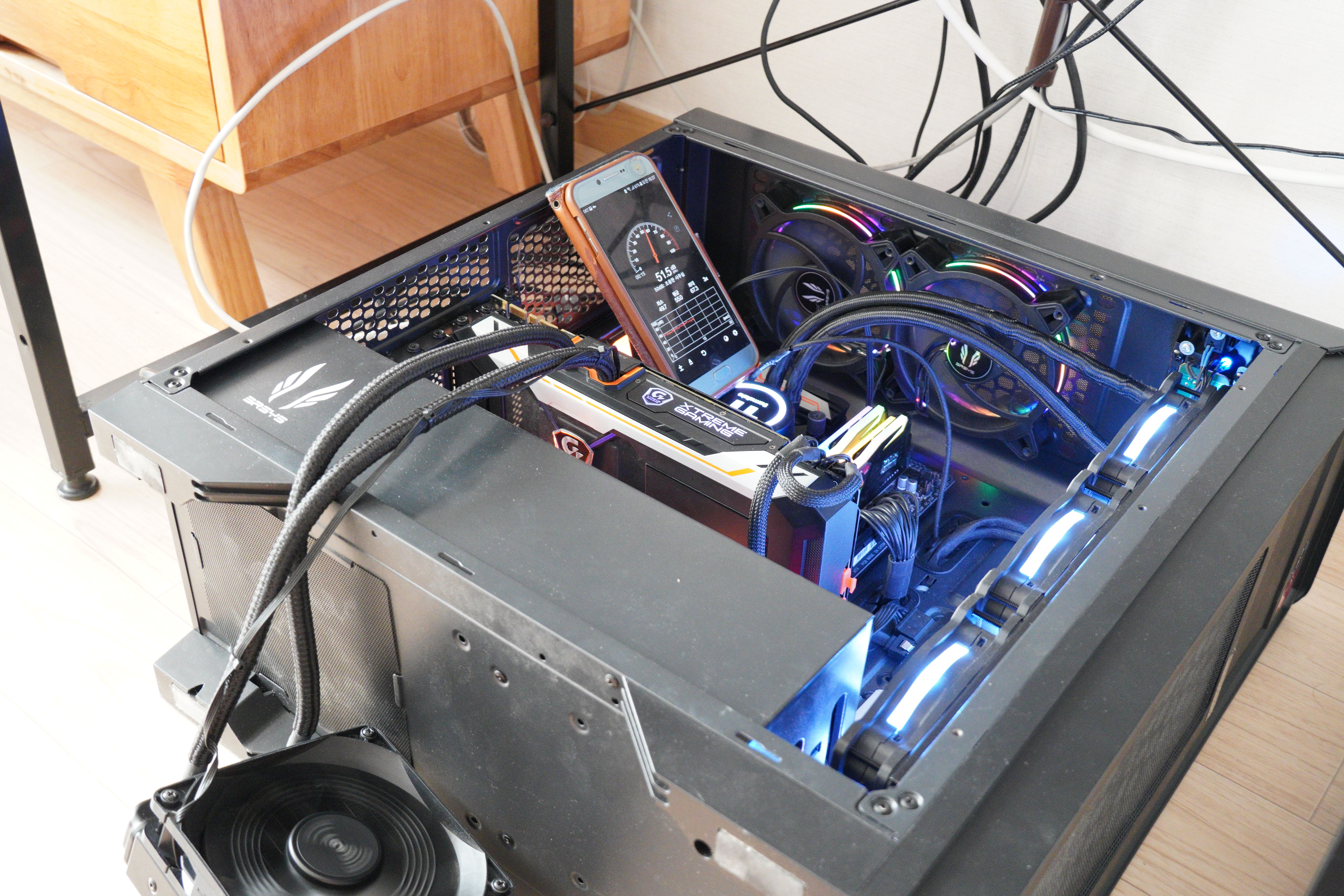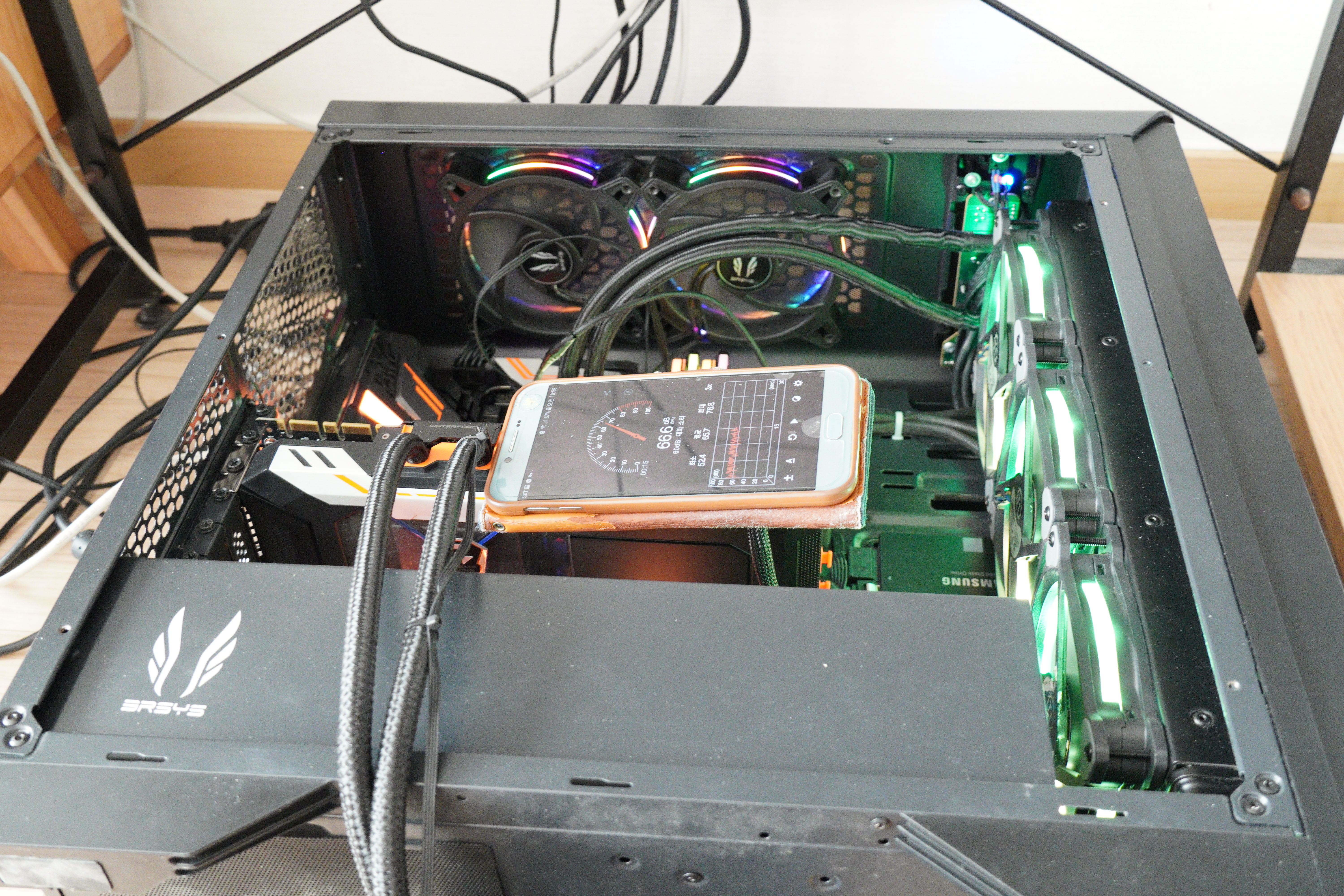 장착 후 테스트는 다음과 같이 진행하였습니다. 소음 테스트에 영향을 줄 수 있는 그래픽카드 쿨러는 잠시 제거하고, 상단 팬은 LOW 상태로 최저 RPM으로 돌아가도록 했습니다. 마이크는 펌프에 근접하여 물려놨습니다.