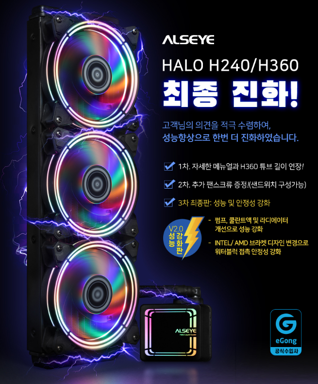 보시면 기존 제품과 외형은 동일하지만, 펌프, 냉각수, 라디에이터를 개선하여 성능강화를 하였다고 왔습니다. 제가 찾아보니 가격은 동일하더라고요.