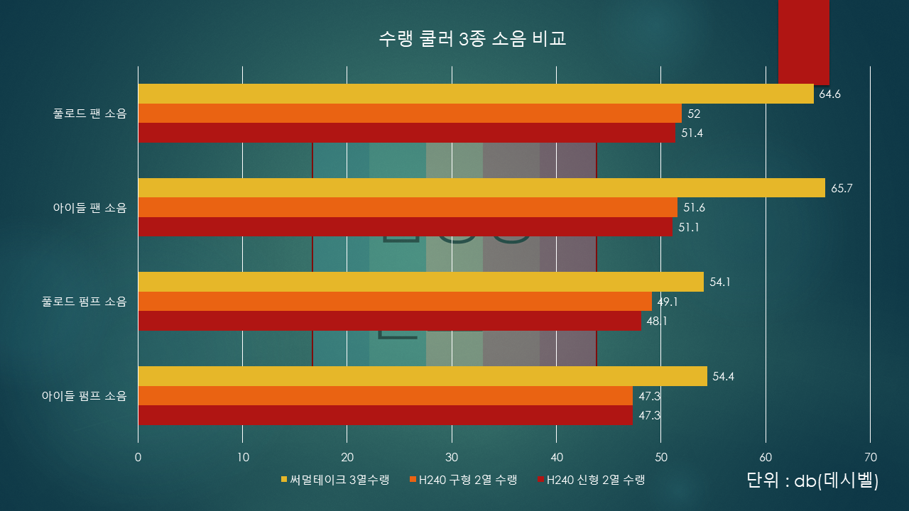 먼저 소음 비교입니다. 확실하게 3열 수랭이 쿨러 팬 소음은 월등합니다. 보시면 팬 소음은 신형이 근소하게 낮게 측정되었습니다.