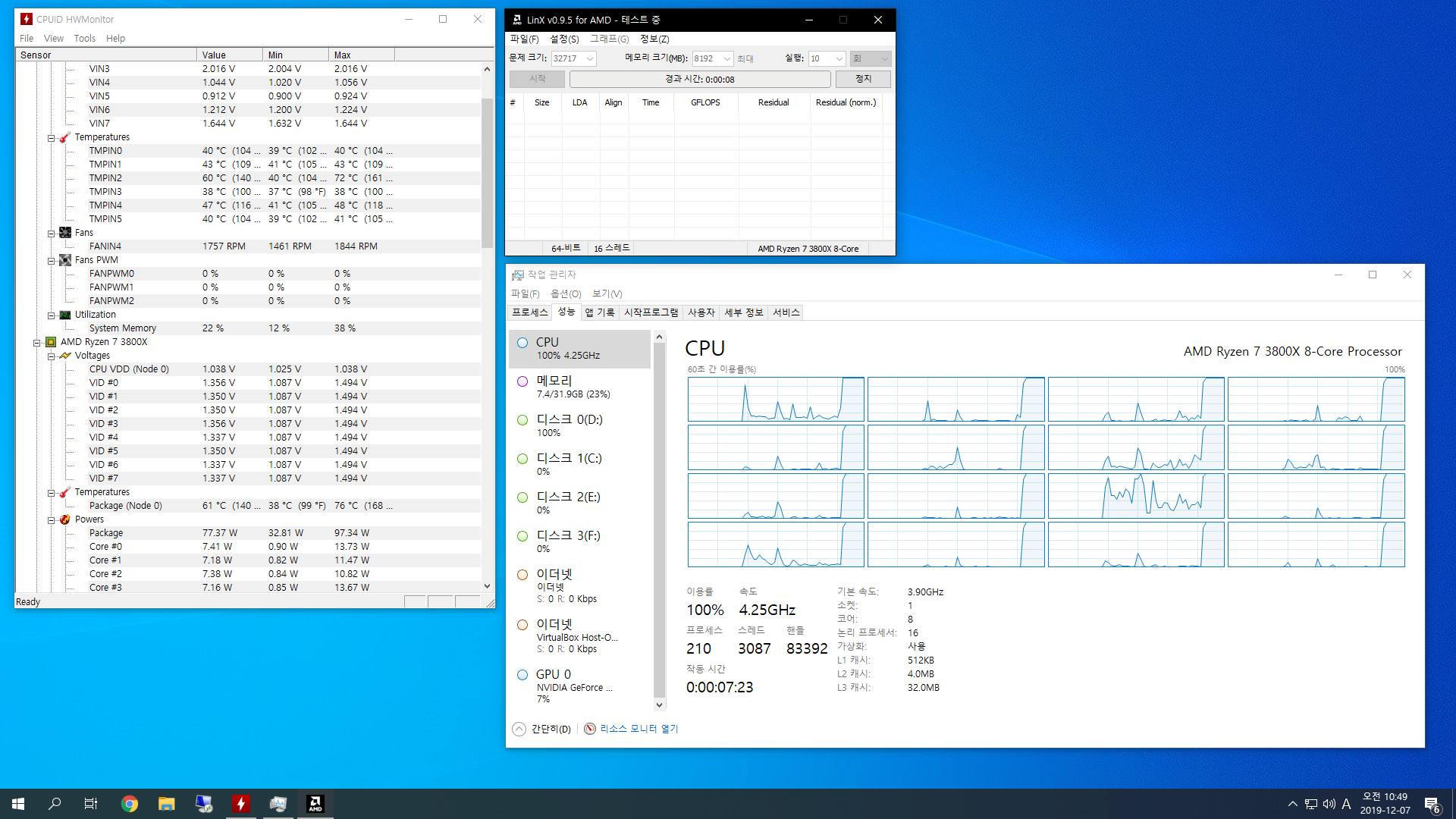 HWMonitor를 통해 CPU 온도를 측정하고, Prime95를 통해 부하를 걸었습니다. 사진은 LinX로 잘못 나왔네욤... 흑