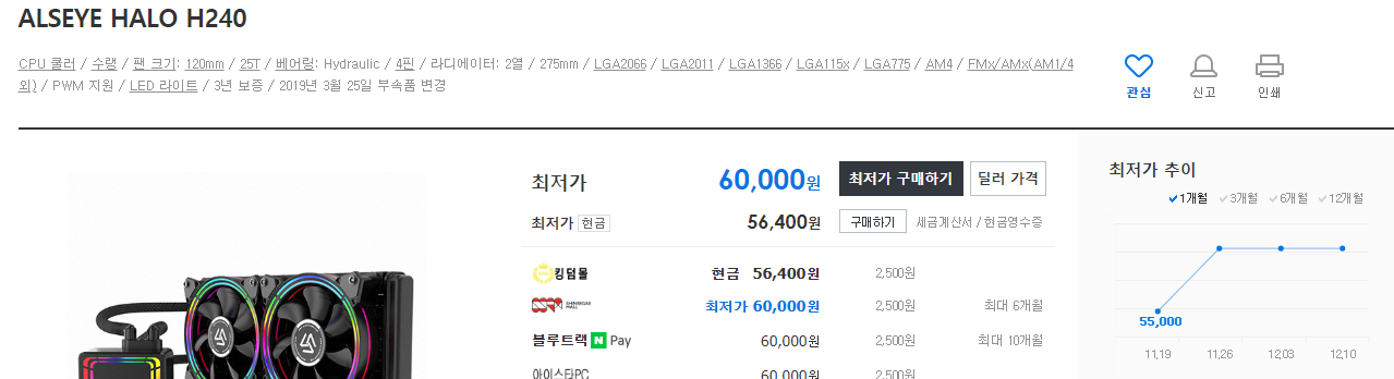 다나와 기준 최저가가 6만원이네요. 6만원을 투자해서 괜찮은 쿨링 솔루션을 찾는다면 괜찮은 선택이라고 생각됩니다.