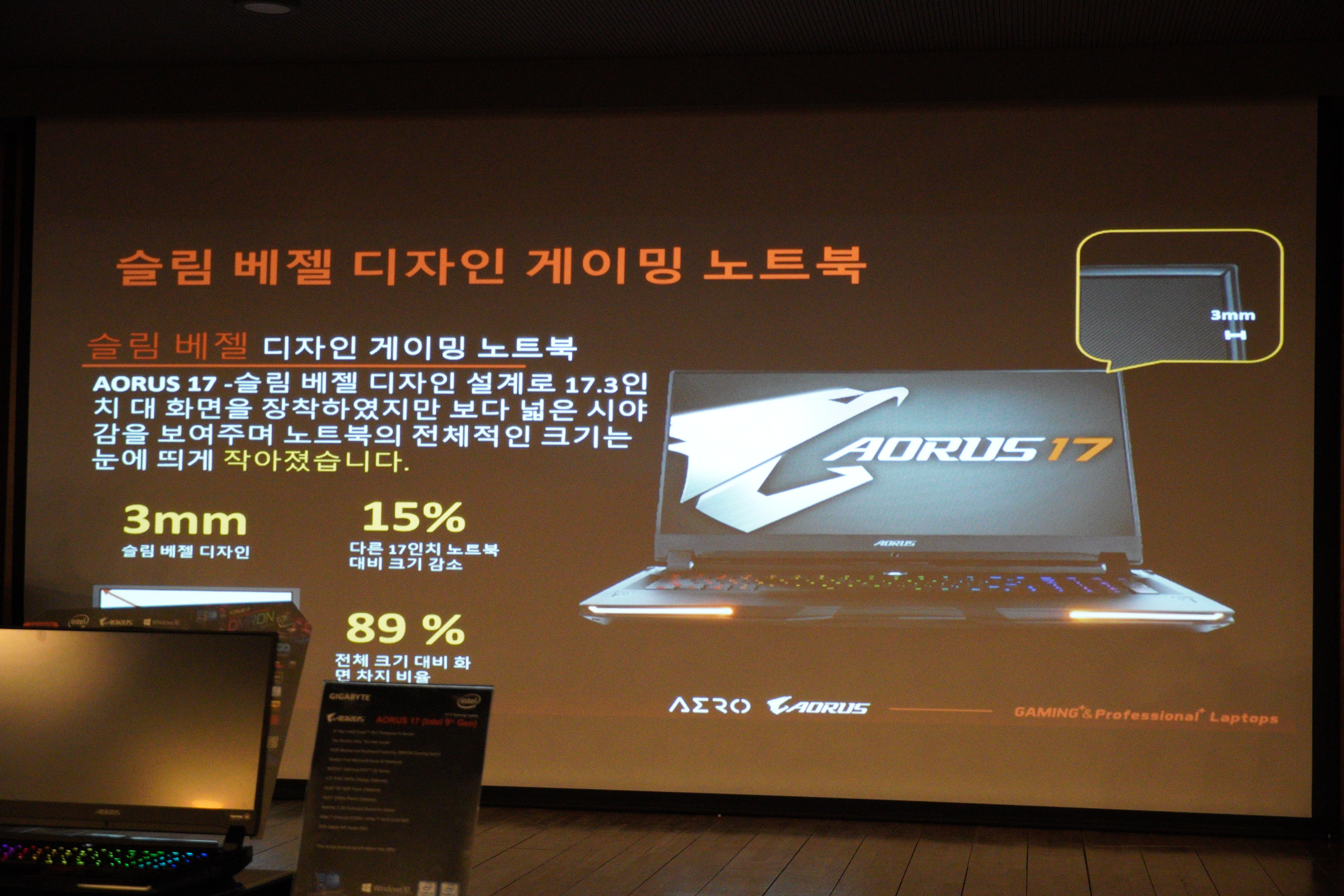 이번 기가바이트의 노트북은 3mm의 초슬림 베젤 디자인으로, 노트북의 크기는 유지하면서 디스플레이 크기를 늘렸습니다. 실제로 보면 엄청 얇아서 어떻게 만들었는지 궁금할 정도입니다.