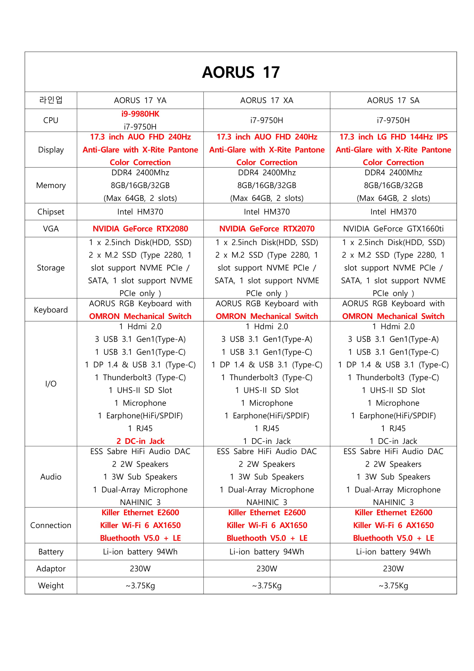 모든 제품은 기본적으로 X-Rite Pantone Color Correction이 되어있는 패널이 탑재되어 원색에 가까운 색감을 내주며, 킬러랜을 탑재하여 무선통신상의 지연시간을 줄였습니다. 더불어 옴론 기계식 키보드가 탑재되어있습니다.