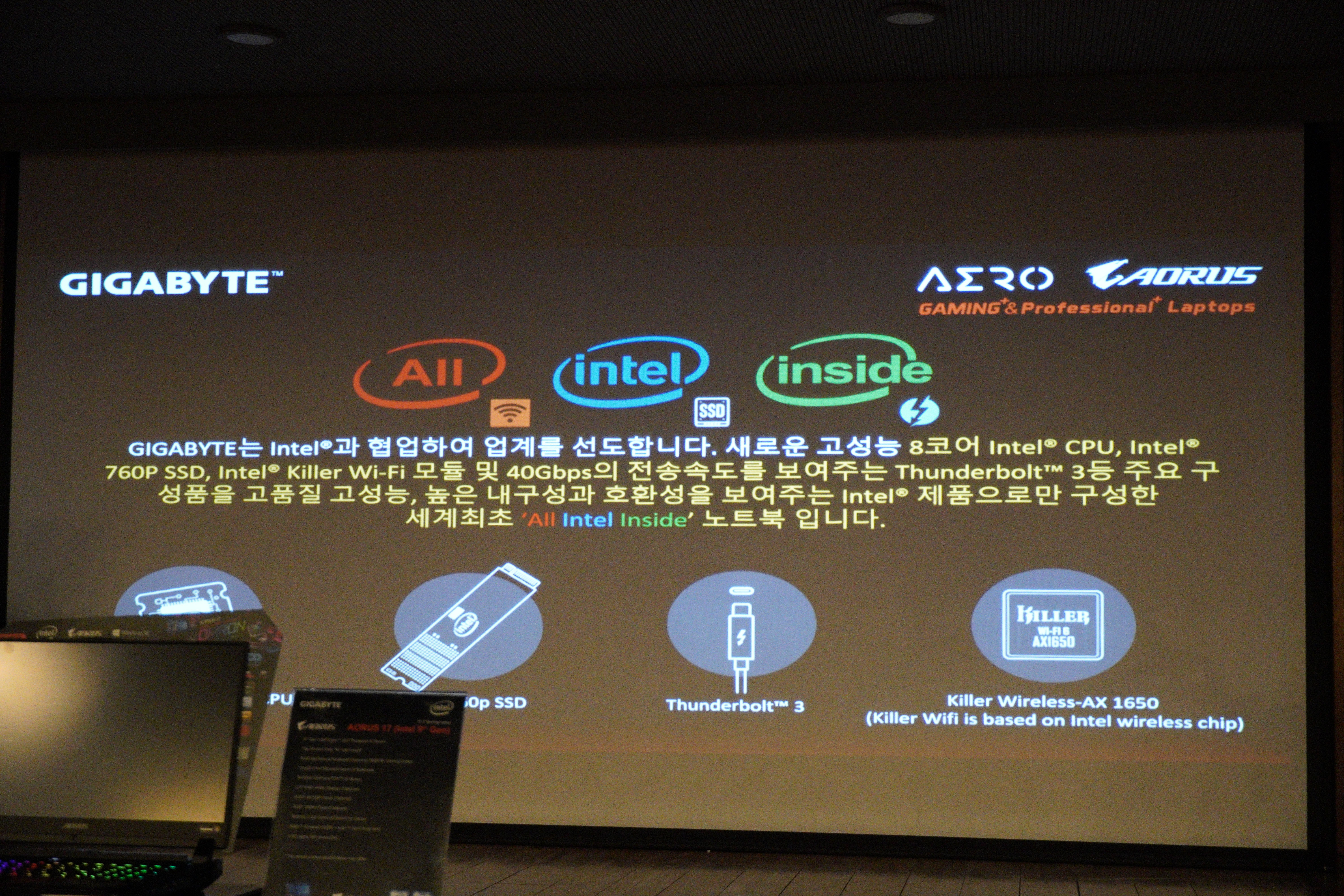 이번 기가바이트 신작 노트북은 ALL INTEL INSIDE를 슬로건으로, 사용되는 CPU, SSD, I/O 포트, 컨트롤러, 칩셋, 무선랜 칩셋 등, 모든 부품을 인텔사의 제품으로 제작하여 고품질, 고성능, 높은 내구성과 호환성을 보여준다고 합니다.