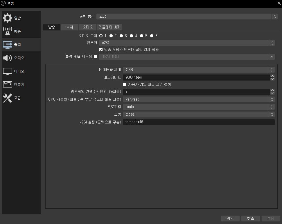 마지막으로 x264 설정은, 본인의 논리 프로세서 수를 적어주시면 됩니다.