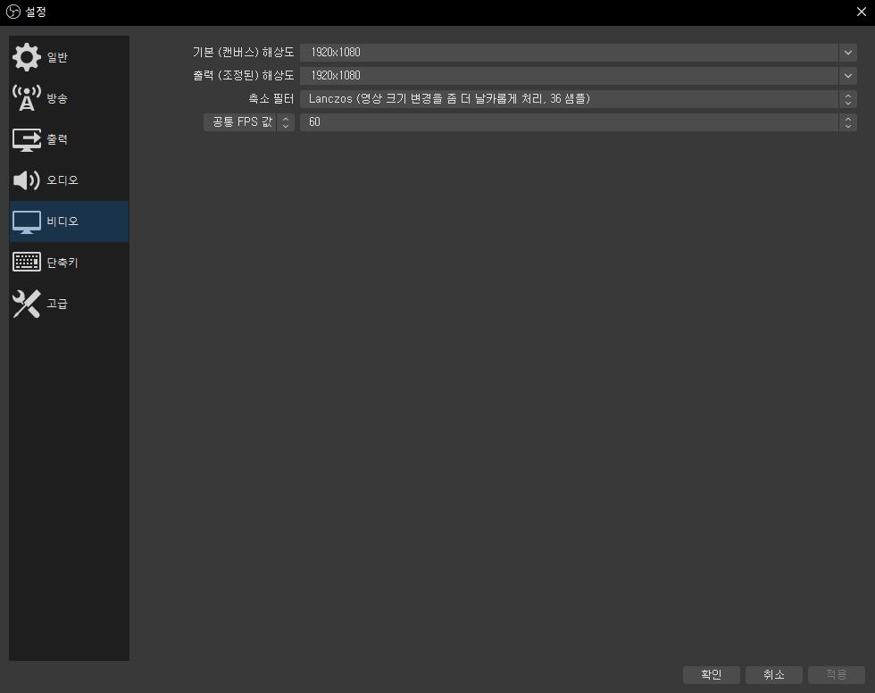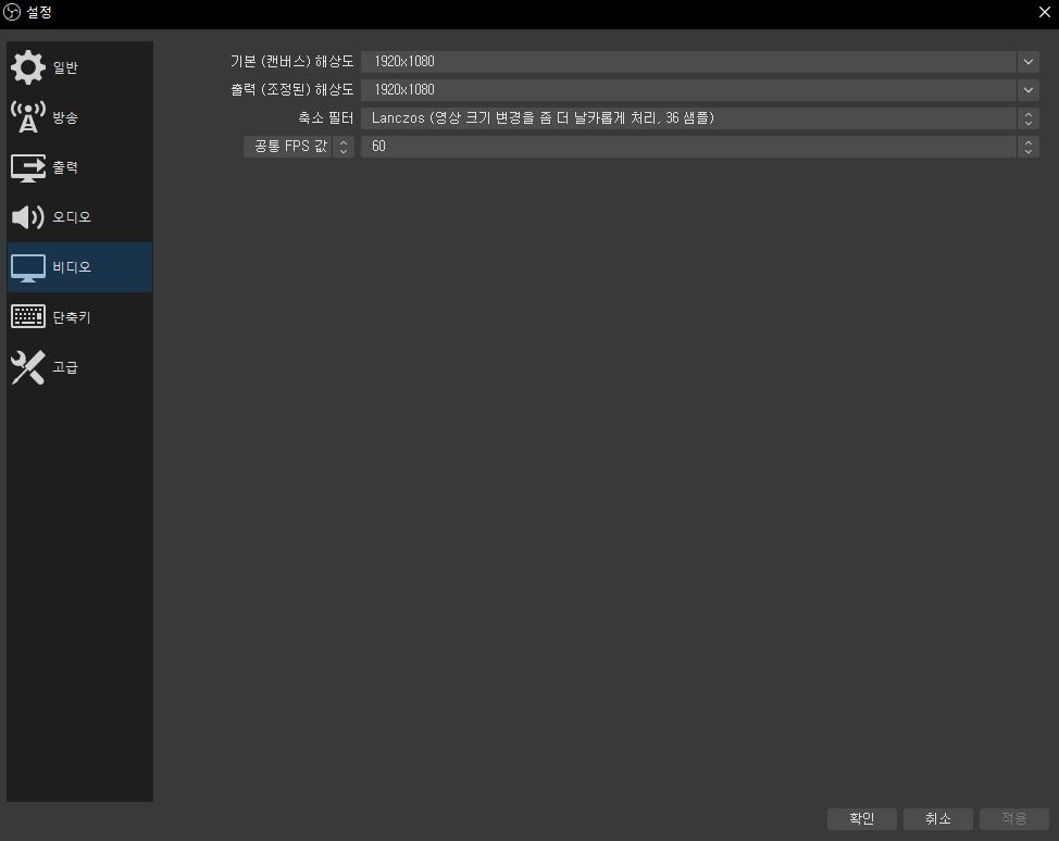 다음은 비디오 설정입니다. 기본 해상도와 출력 해상도를 본인이 필요한것으로 변경하시기 바랍니다.