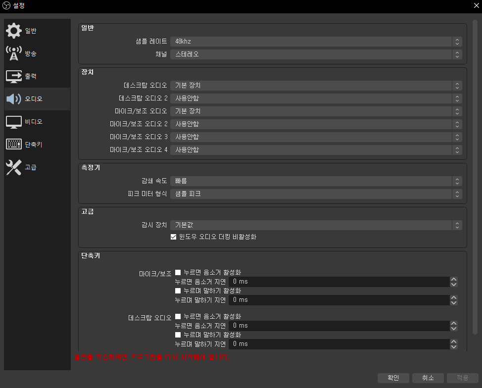 다음은 오디오입니다. 샘플레이트의 기본값은 44.1khz입니다. 48khz로 변경해주시기 바랍니다.