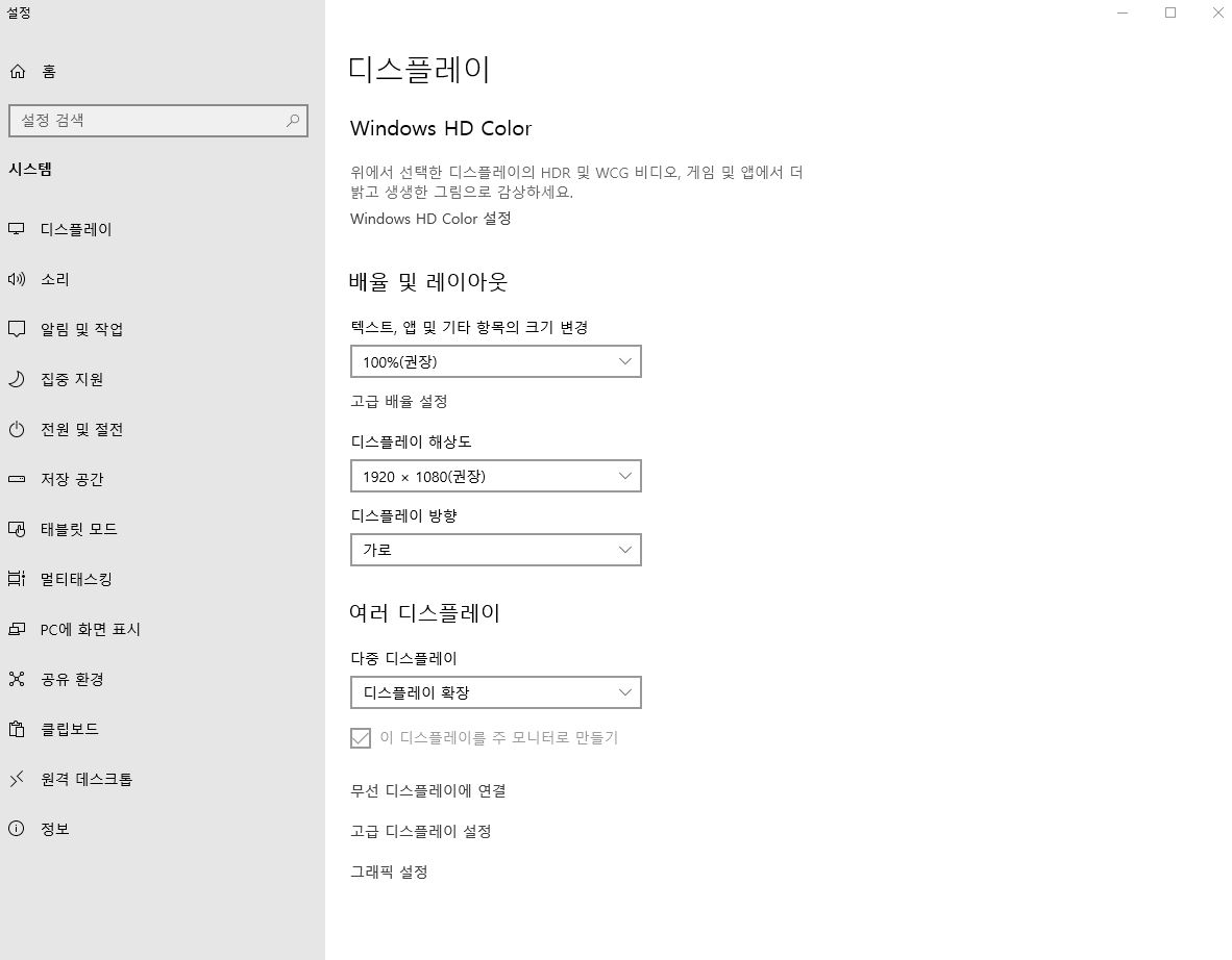 한가지 중요한 사항이라면, 최대한 기본해상도 = 출력 해상도로 설정하는게 좋습니다. 왜냐하면, 출력 배율 재조정에 들어가면 화질열화가 생기기 때문이죠.
