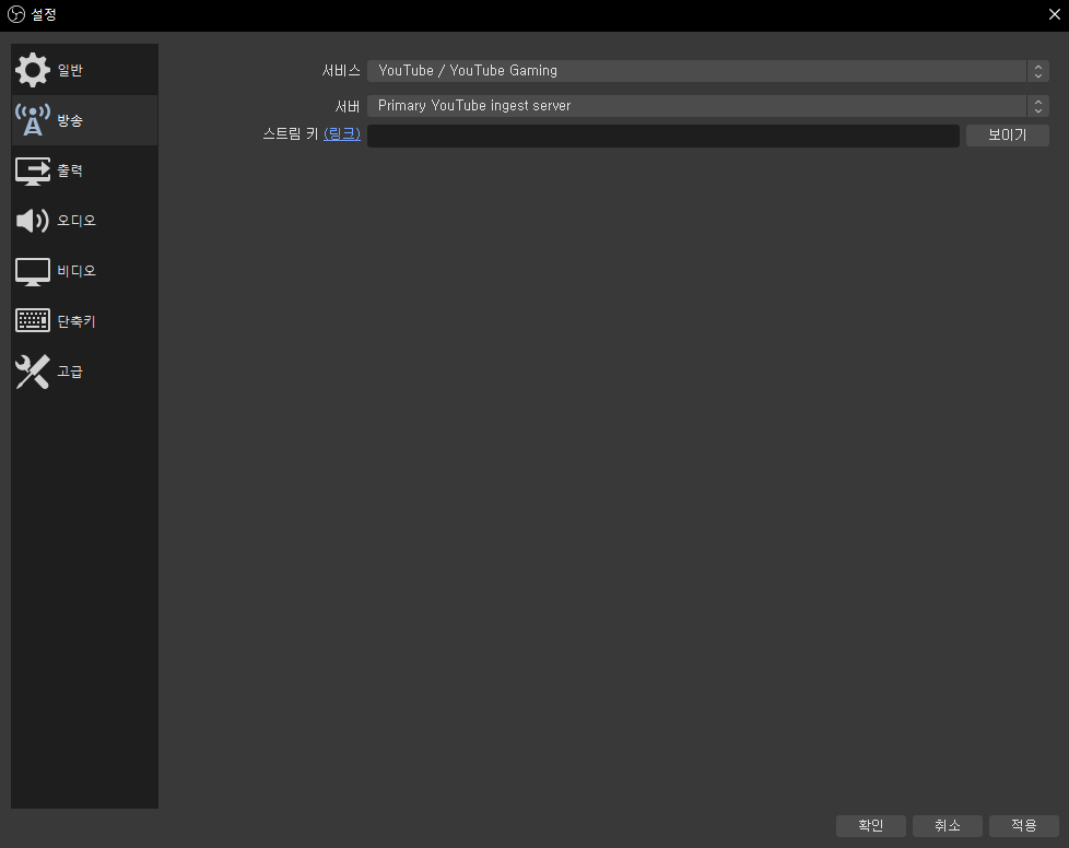 먼저 간단한 설정을 하겠습니다. 방송 탭에 가시면 스트리밍 플랫폼을 선택할 수 있습니다. 본인이 사용할 플랫폼을 고른 후, 스트림 키를 입력합니다.