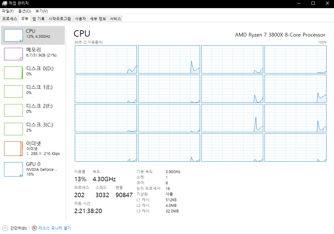 하단에 작은 글씨로 논리 프로세서라고 보입니다. 저의 경우 3800X이므로 8코어 16쓰레드로 나오네요.