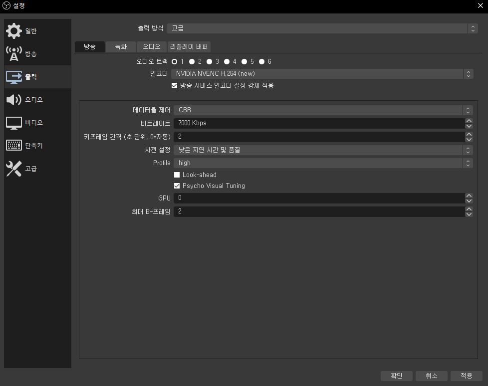NVENC의 경우 다음과 같이 설정하였습니다.