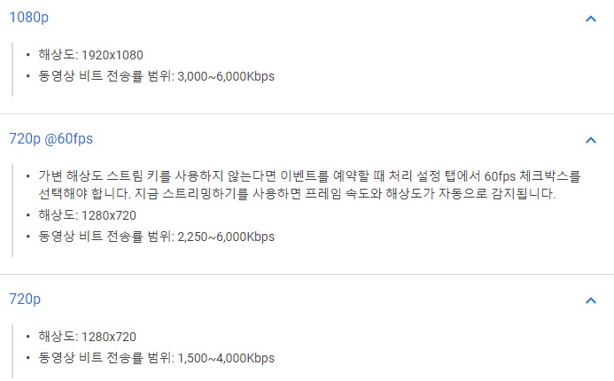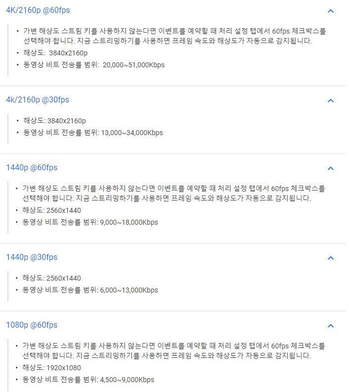 유튜브에서 제공하는 권장 비트레이트입니다. 비트레이트는 말 그대로 전송하는 데이터 기준량을 말하는겁니다. 높을수록 많은 데이터를 보내어 화질이 향상됩니다.