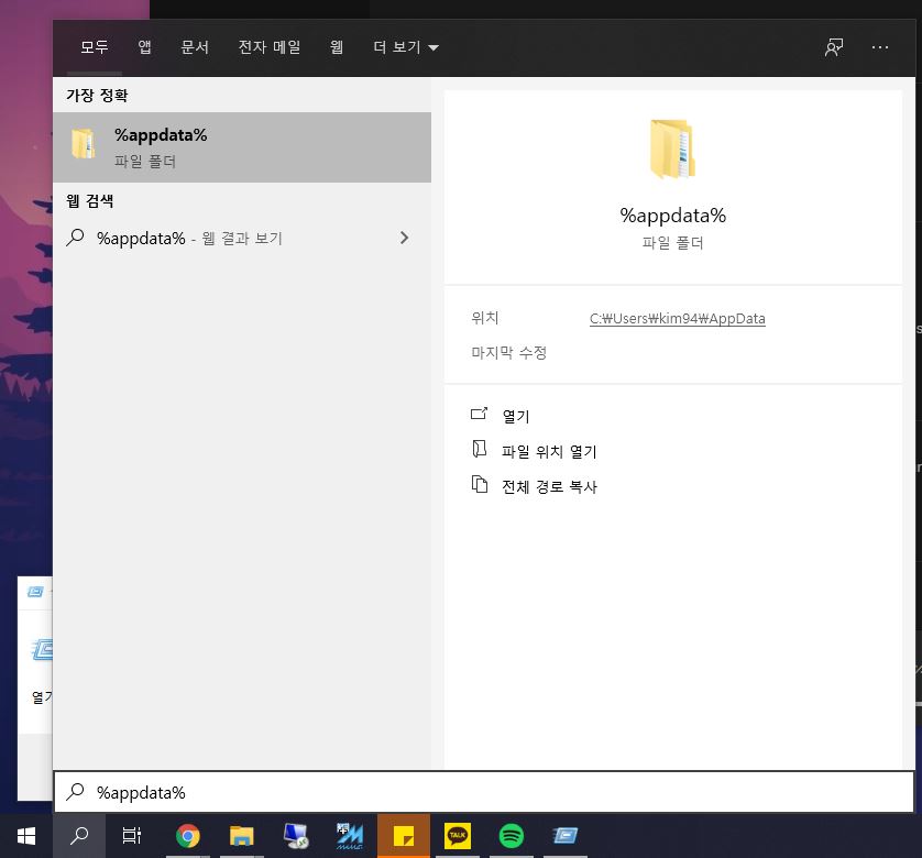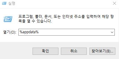 왼쪽 아래 검색 버튼을 눌러 사진처럼 %appdata%를 입력합니다
