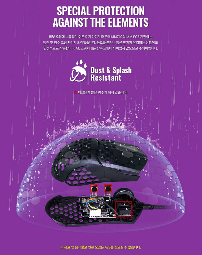 참고로 기판은 모두 방수처리가 되어있다고 합니다. 스위치를 제외하고는 전부 방수처리가 되어있으며, 음료 및 음식물로 인한 오염은 A/S를 받을 수 없습니다.