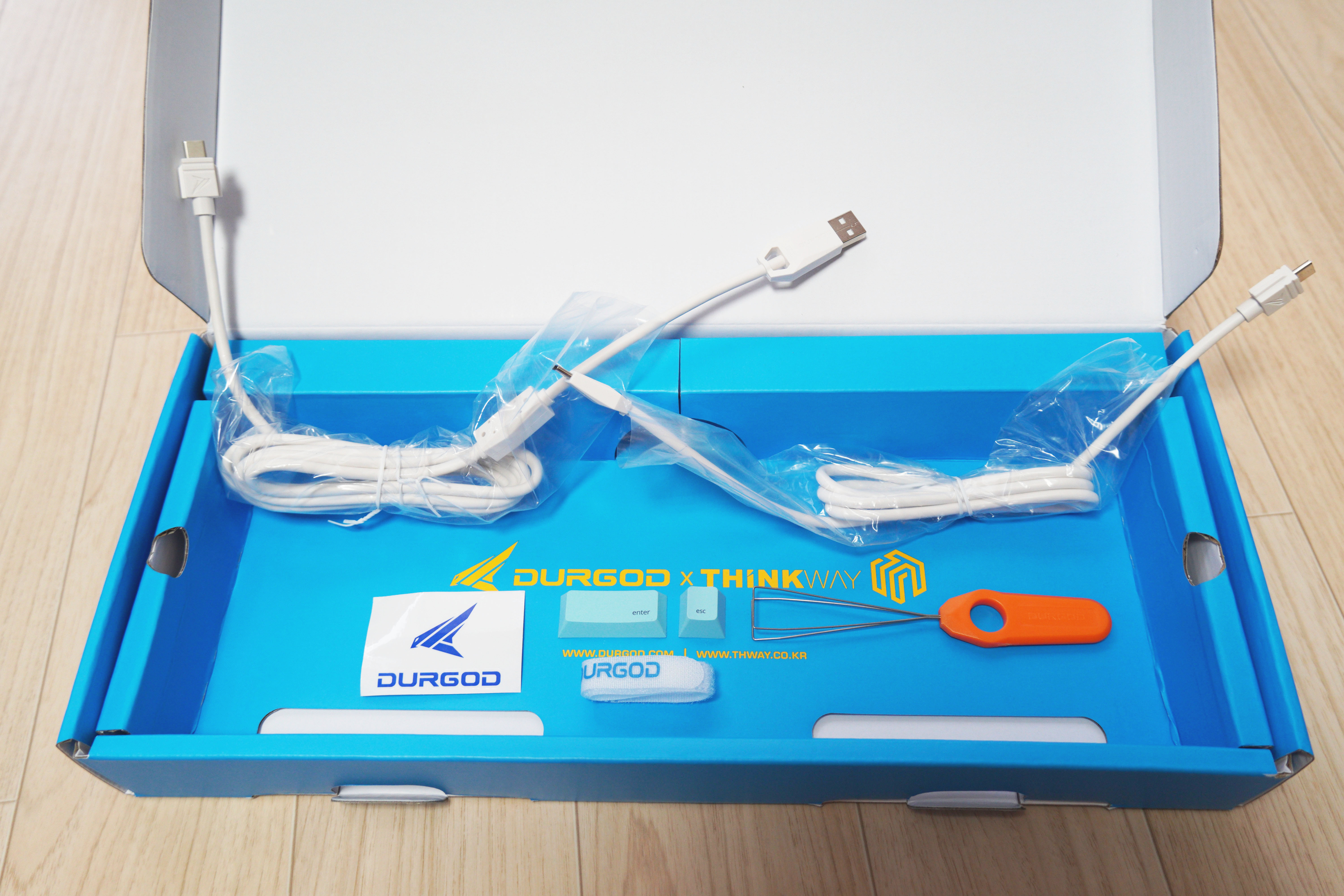 먼저 포함된 주변기기들을 먼저 보겠습니다. Type-C to Type-C 케이블과 Type-C to Type-A 케이블, 키캡 리무버, 여분의 키캡(ESC와 Shift 버튼이 포인트키캡으로 노랑색이 장착되어있는데, 같은 색상인 파랑으로 변경 가능합니다.) 선 정리용 찍찍이, 듀가드 로고 스티커가 있습니다.