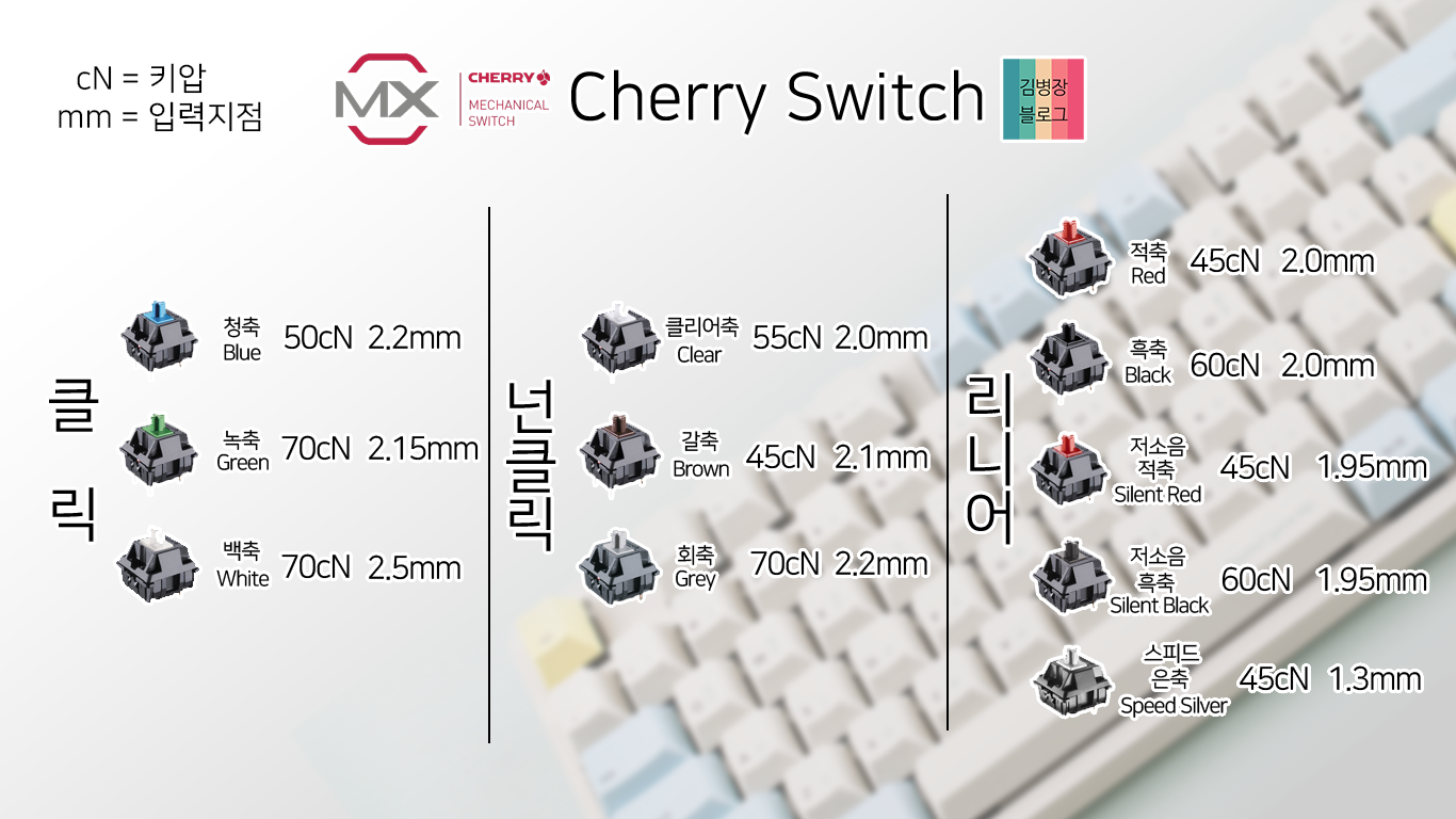 간단하게 체리스위치를 정리해보았습니다. 은축은 간단하게 말하면 가벼운 느낌의 적축입니다. 적축의 조용함을 가지고 가벼운 키압을 적용하여 구름을 누르는것 같은 입력이 가능합니다.