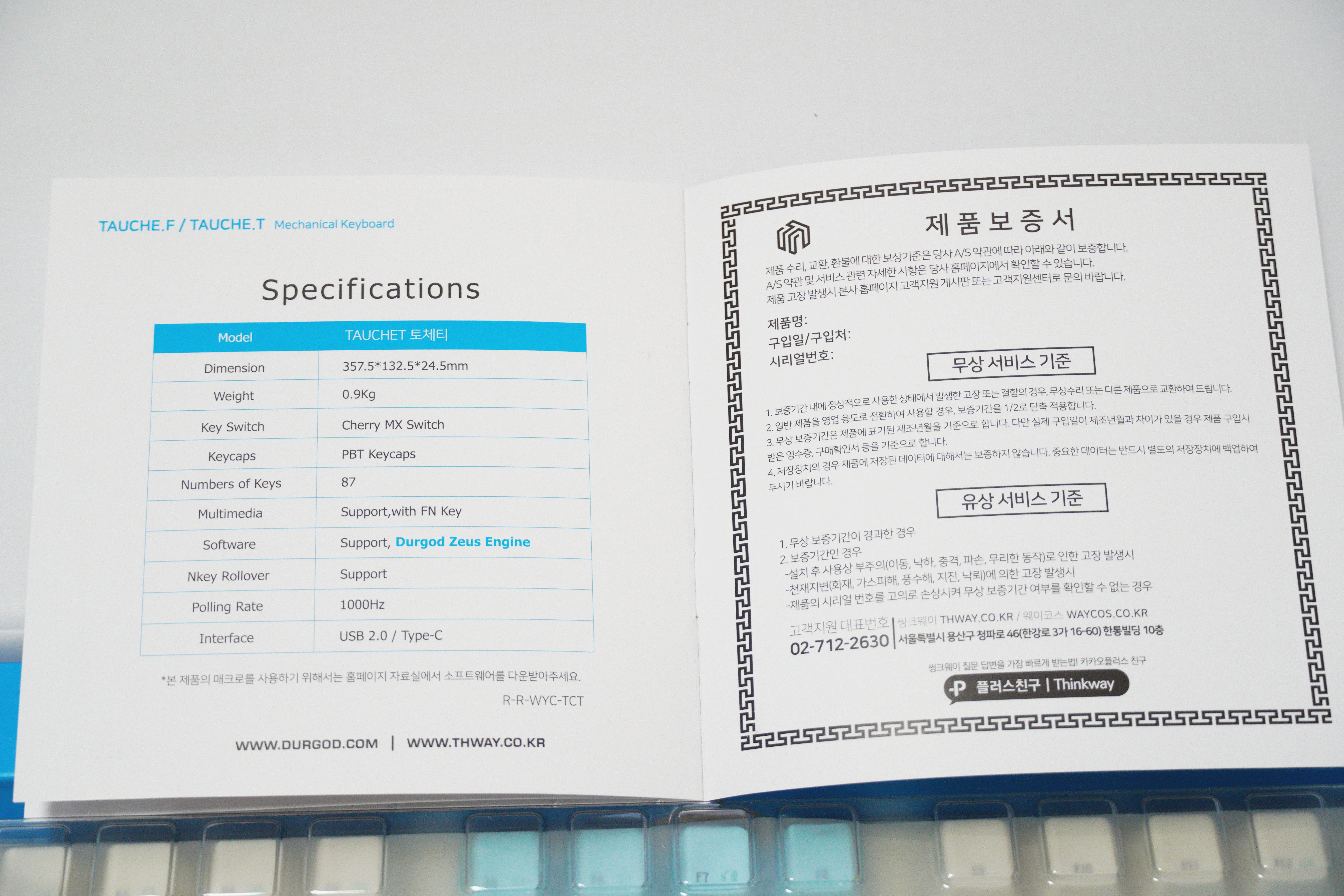 설명서 후면에는 간단한 설명이 있네요. 내구성 높기로 유명한 듀가드와 씽크웨이가 협업하여 키보드를 생산하였다고 합니다.