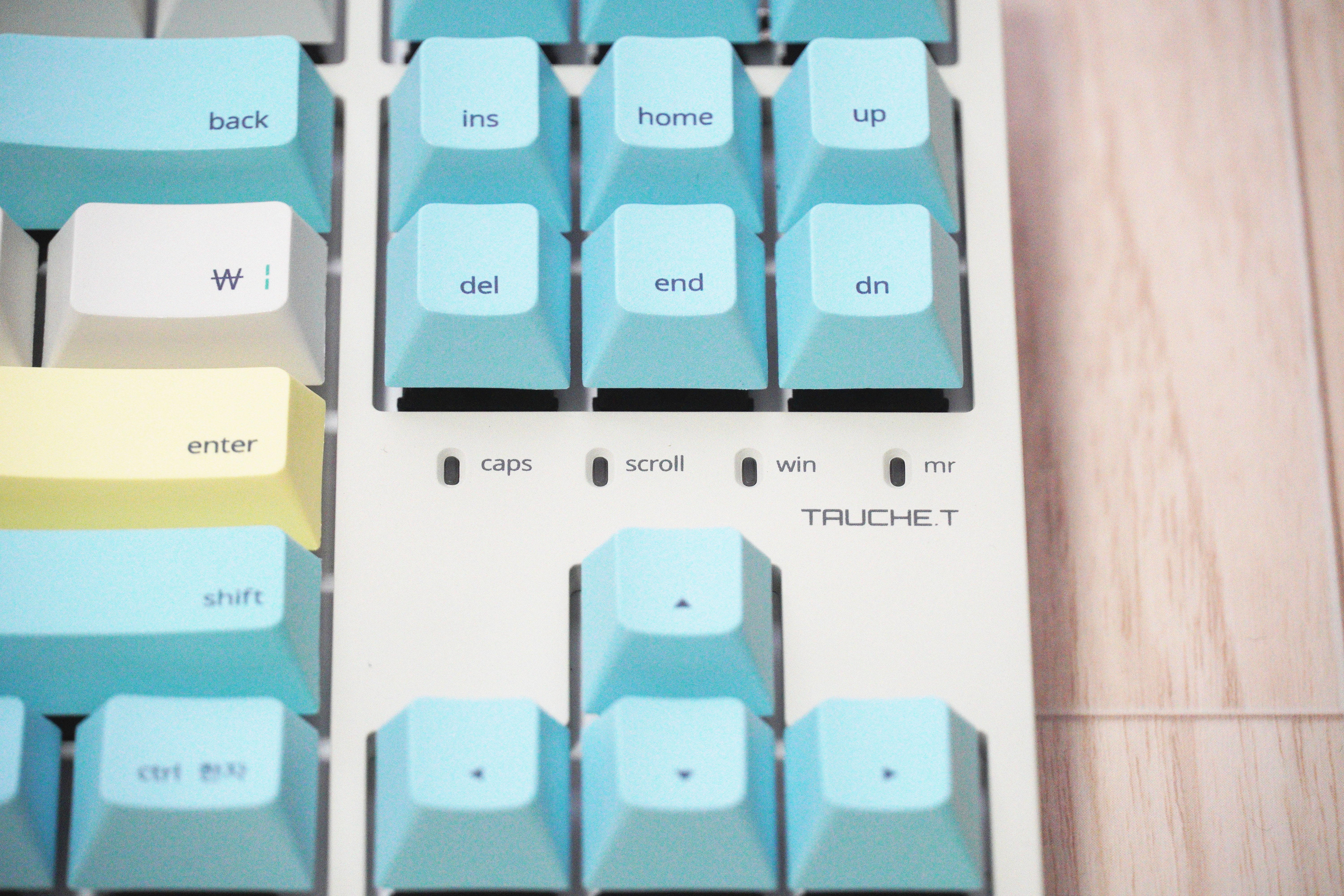 키보드 본품입니다. 보면서 처음 든 느낌이 키캡이 이쁘다 였습니다. 진짜 색감이 이쁘고 키캡에 각인된 글씨체도 귀엽습니다. 상당히 세련되고 정갈한 느낌을 주기 위해 노력한 모습이 보였습니다.