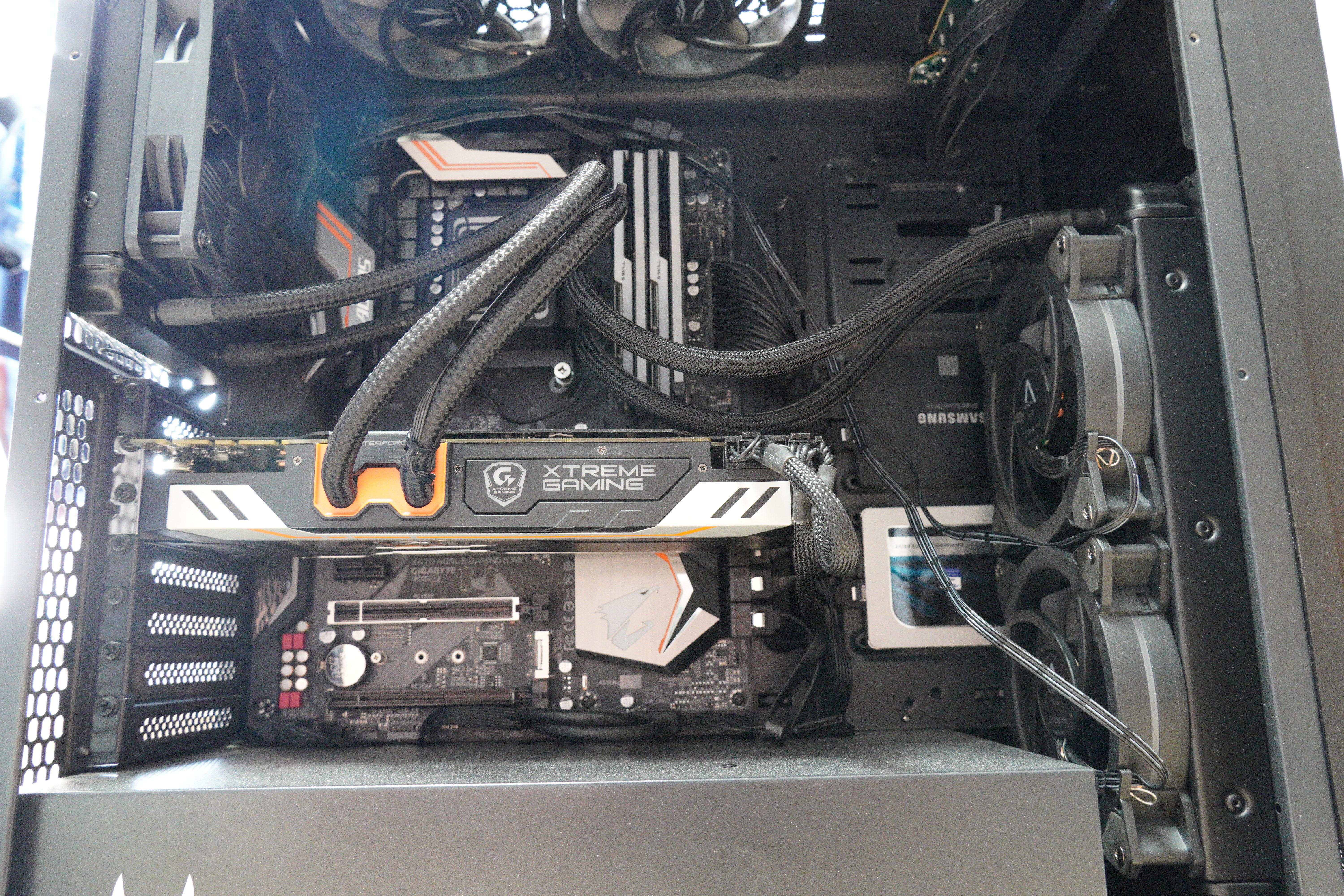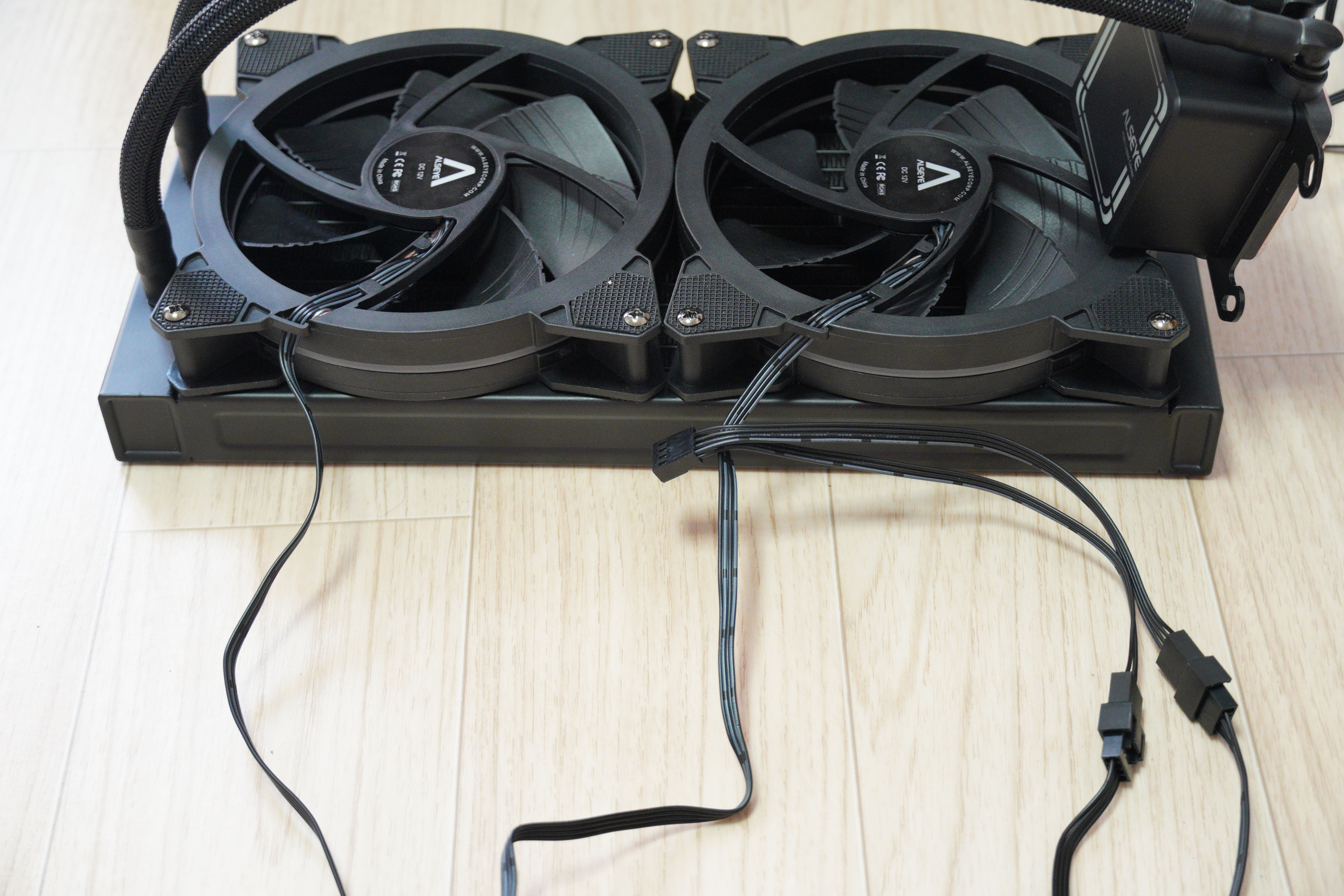 팬을 쿨러에 장착시키고 전원선까지 모두 연결하였습니다. 역시 140mm팬 x 2인만큼 큼직하고 듬직하네요.