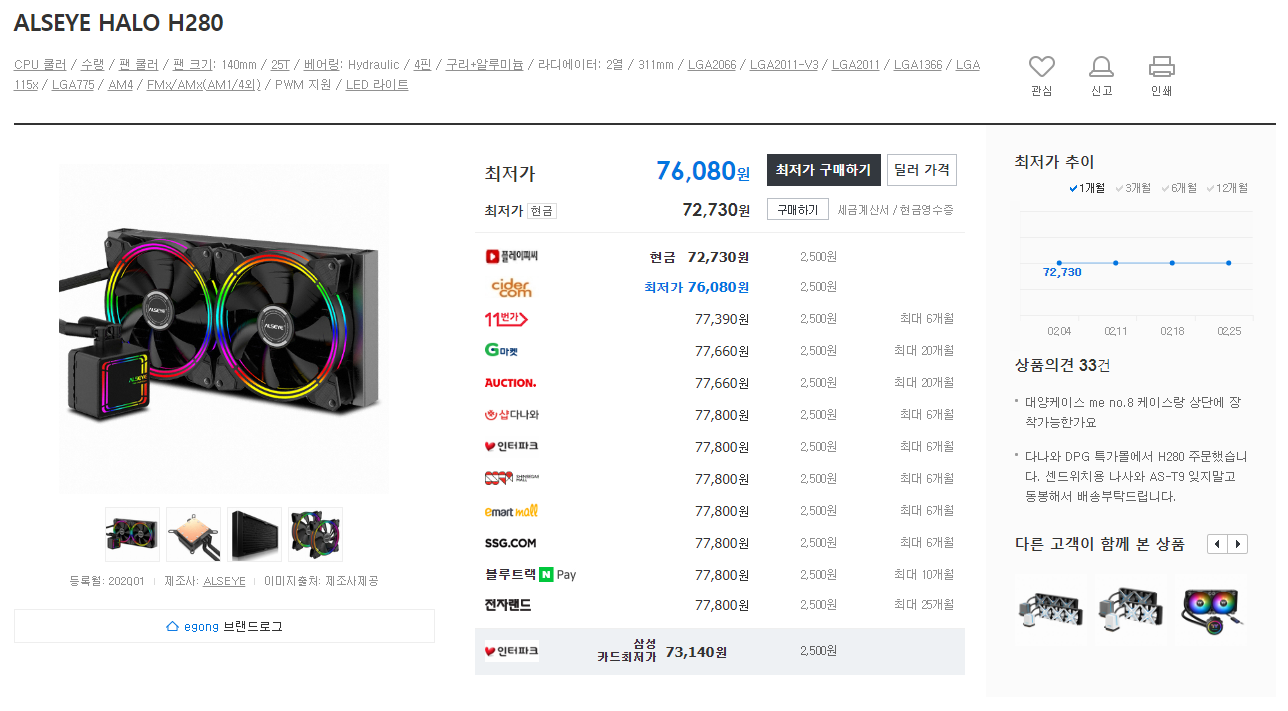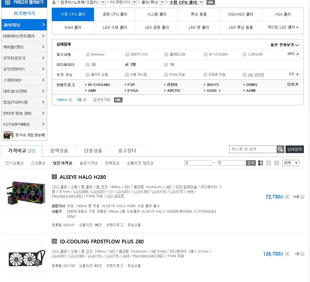 2020년 3월 1일 기준, 다나와에서 140mm 2열수랭 검색때려서 낮은가격순 하면 본 제품이 현금 최저가로 7만2천30원으로 나오고, 바로 다음제품이 13만 5천7백원입니다.