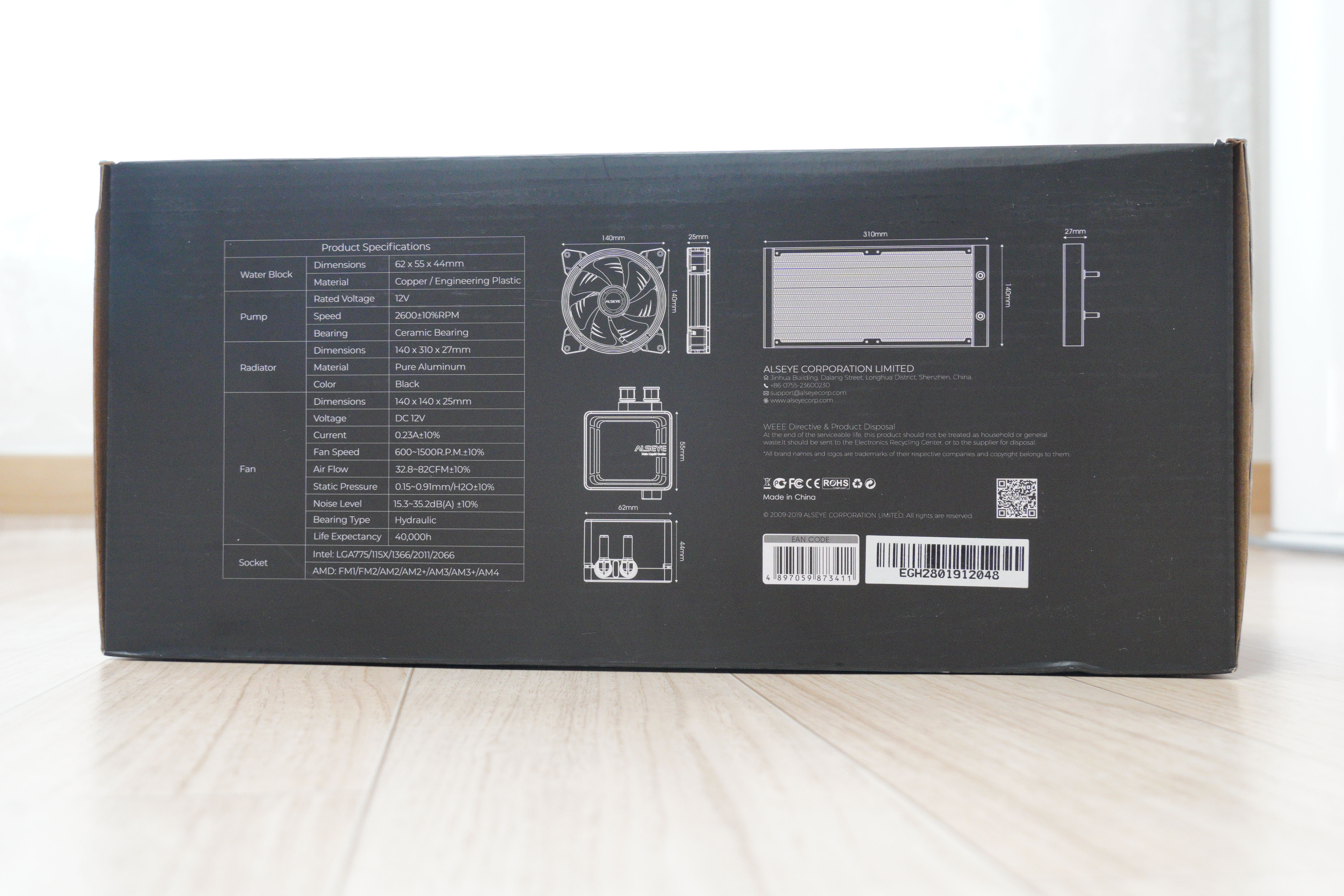 후면에는 스펙표와 워터블록 / 팬 / 라디에이터 사이즈가 적혀있습니다.