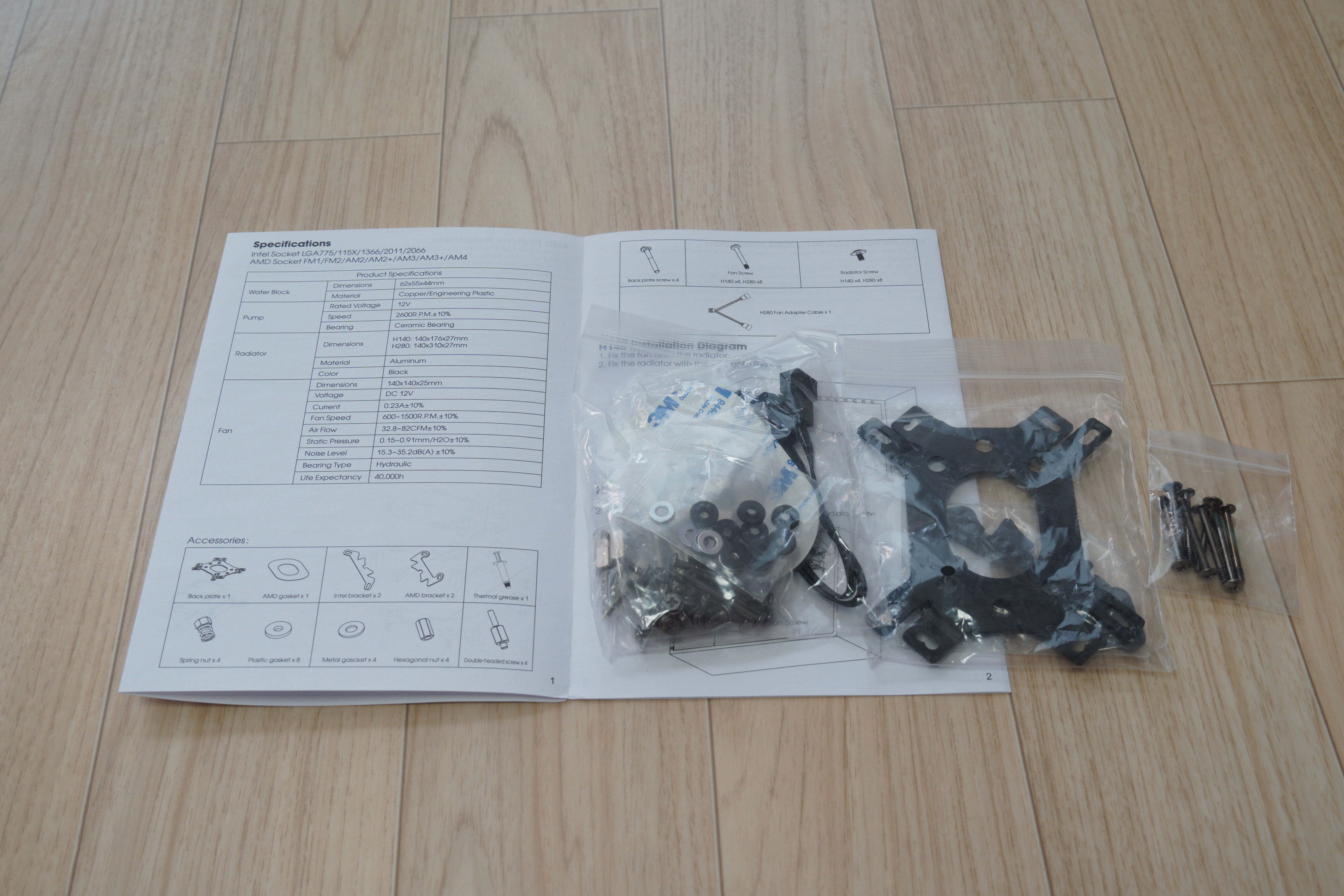 박스를 오픈해서 제품을 꺼내보았습니다. 일체형 수랭쿨러 본품과 140mm팬 두개, 부속품들이 들어있습니다.