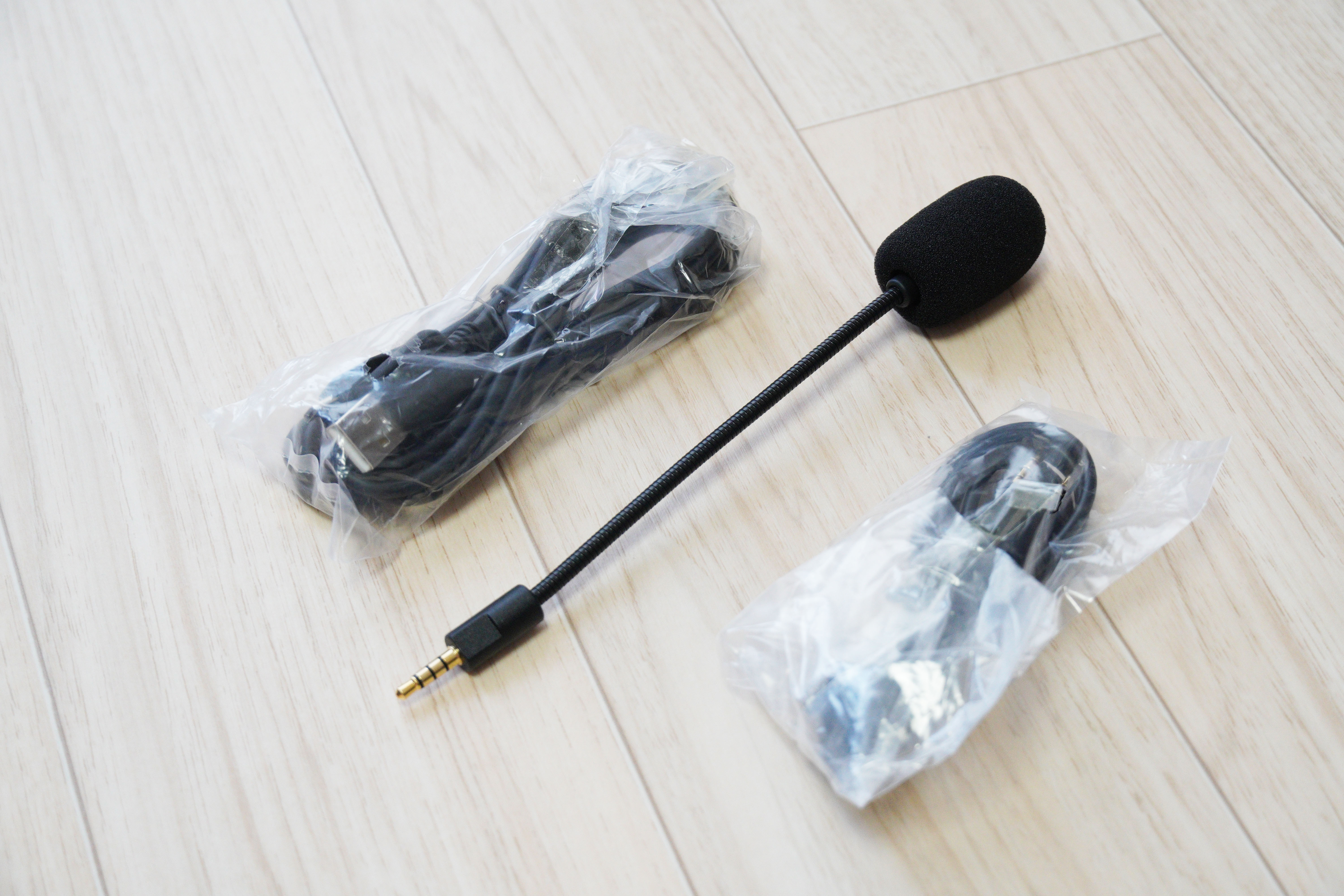 연결선이 있는 비닐을 열면, 윈드스크린이 장착된 붐마이크, 헤드셋 연결을 위한 3.5mm to 3.5mm 1.5m 선과 USB Type-A to USB micro-B 2m 연결선이 있습니다.