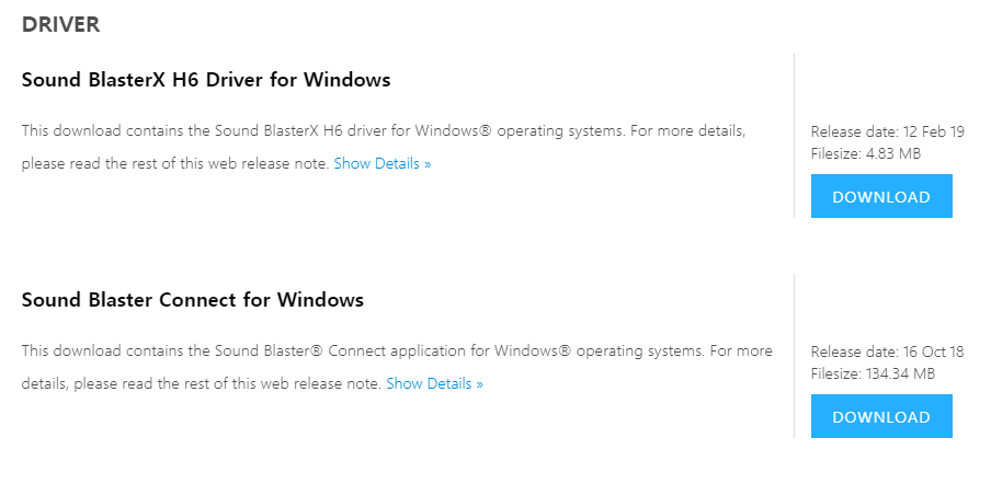여기 접속하면 하단에 전용 SW와 드라이버를 받을 수 있는데, 먼저 Sound BlasterX H6 Driver for Windows 를 다운로드 하셔서 드라이버를 먼저 받으시고 설치한 뒤에 , 하단에 Sound Blaster Connect for Windows 라 적혀있는 전용 SW를 다운로드 받으시기 바랍니다.